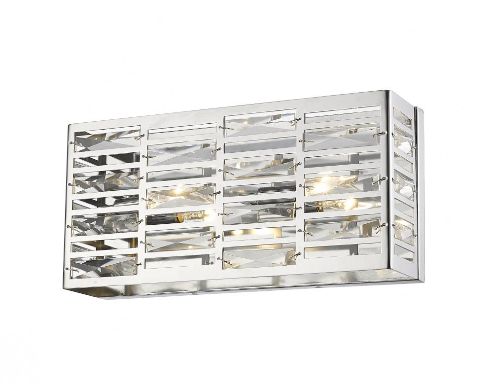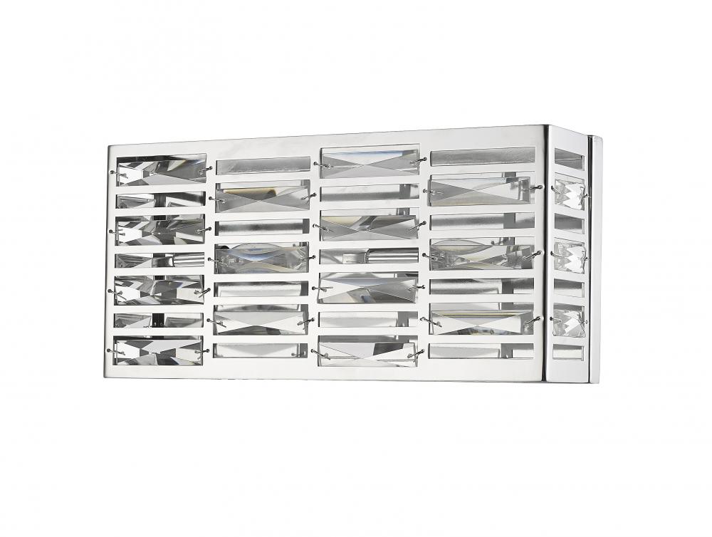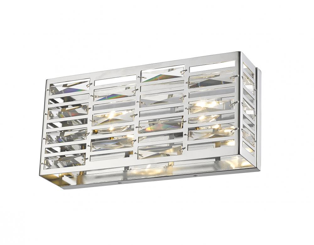 Sleek and elongated, this two-light bath sconce dresses up vanities with bright, modern style. Featuring a rectangular silhouette, the chrome frame is complete with geometric cut out shapes.