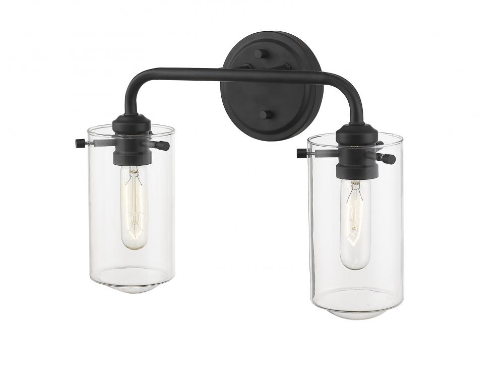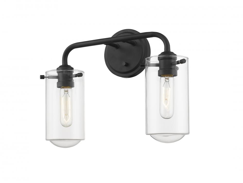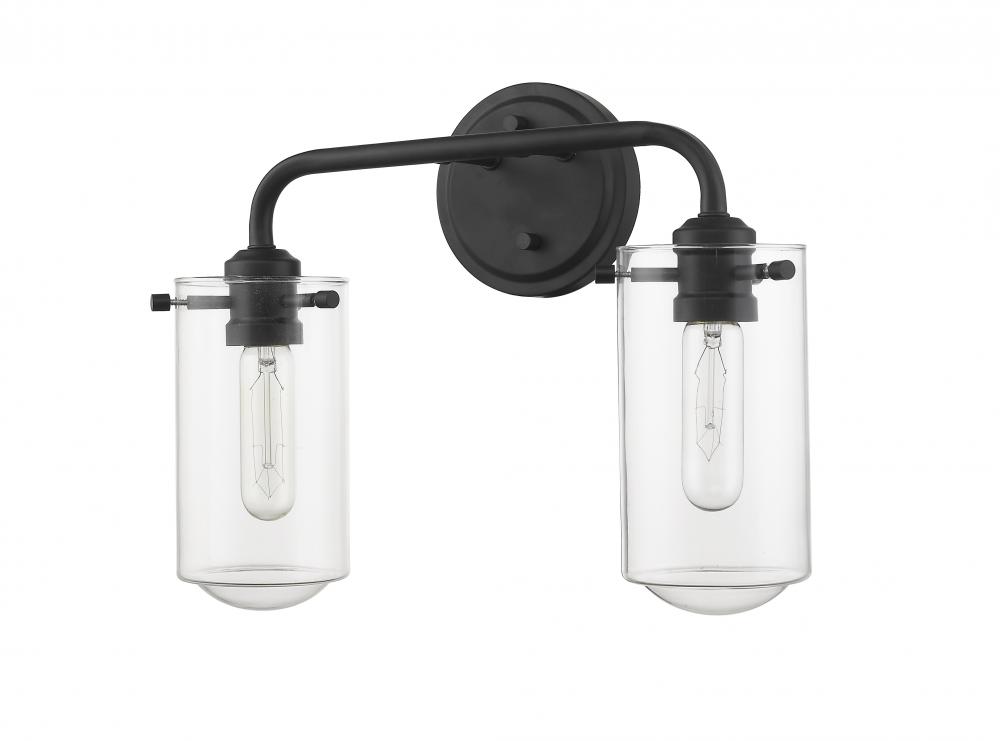 Charming design elements mimic an olde time nautical village theme, delivering ambient lighting as an accent fixture. This two-light wall sconce features beautiful matte black finish metal and tasteful clear glass shades to create an enticing effect.