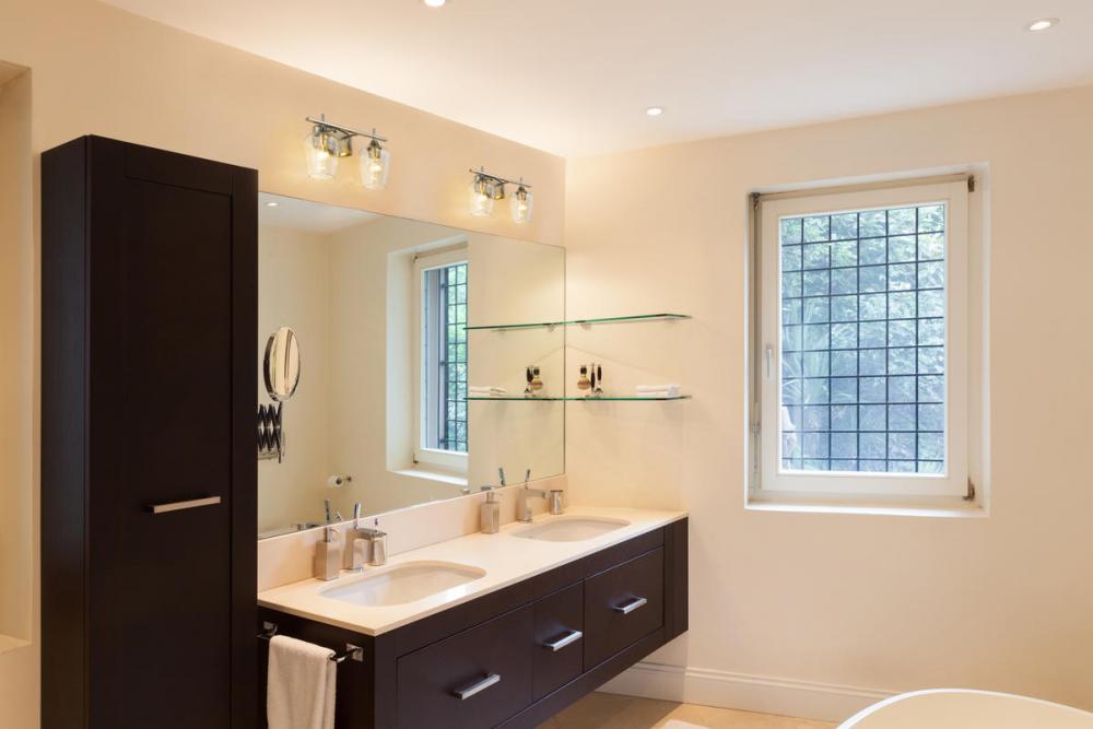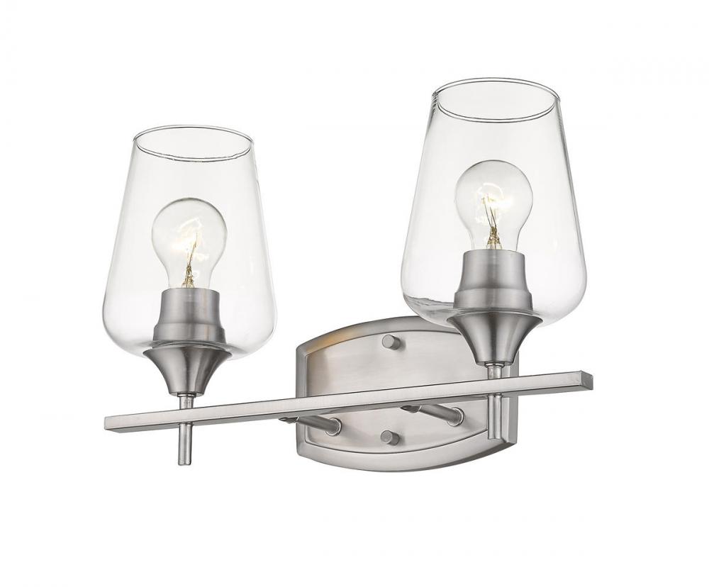 Upscale sophistication with a Mid Century Modern vibe tells the story of this elegant two-light vanity light. A blend of delightful materials offers stunning large glass shades with Brushed Nickel finish metal, delivering a versatile palette that embellishes the look of any transitional bath space.