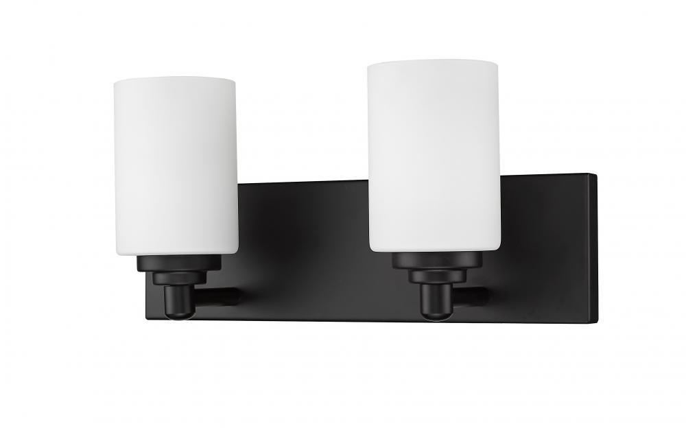 Let your bathroom, bedroom or hallway bask in soft, warm light. This contemporary two-light wall sconce has a sophisticated, streamlined look, and extends from a long mirrored plate for a chic contrast. From the sconces cylindrical white etched glass shades to its matte black finish, this fixture stylishly upgrades your space.