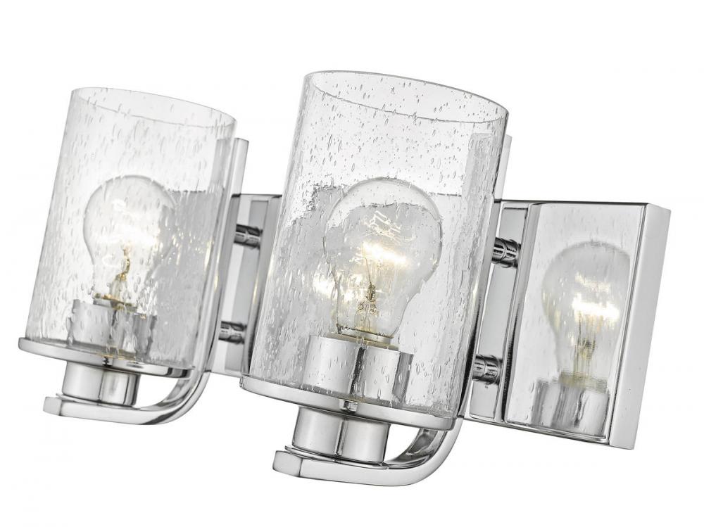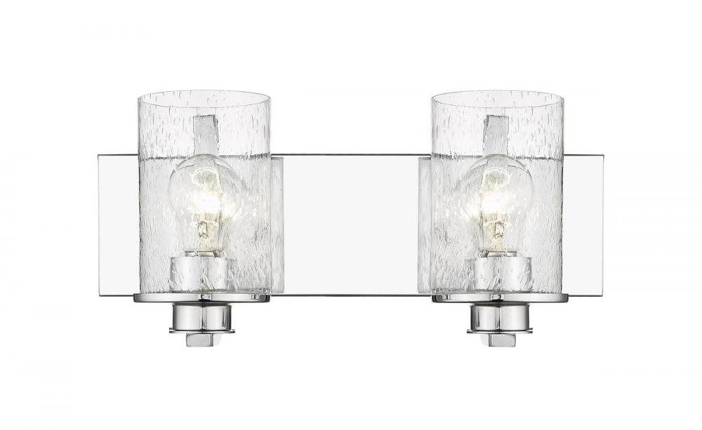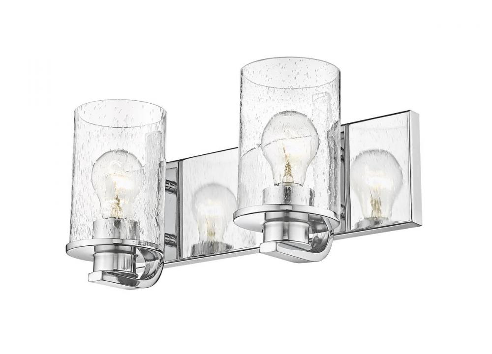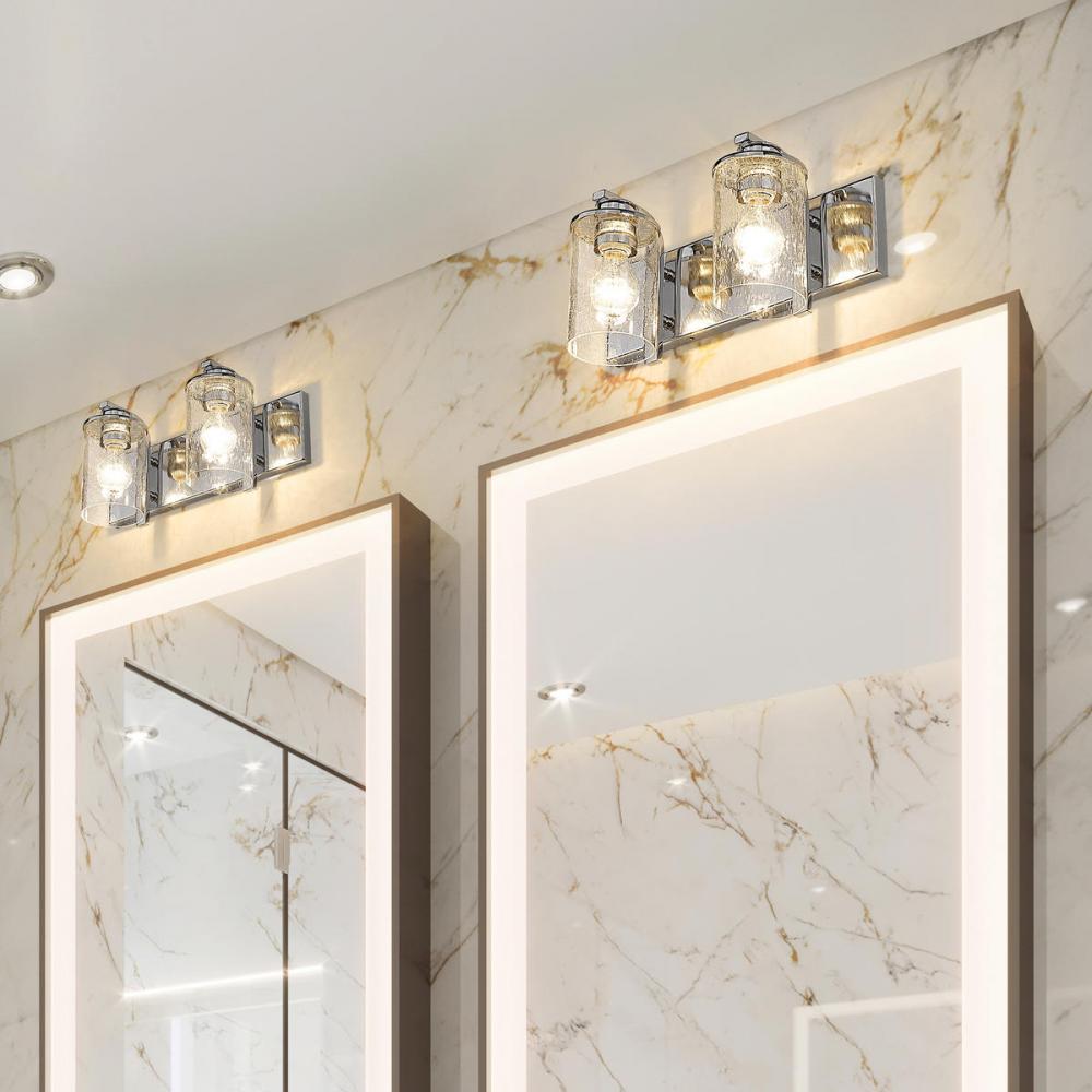 The romantic effect of clear seedy glass adds a custom design element to this contemporary two-light vanity, a great choice for illuminating modern bath and dressing spaces. Glass shades embellish the minimalist yet stylish look of steel frames and mounts made of radiant chrome finish steel. This two-light vanity light from the Beckett collection dresses up a compact bath space with sophistication.