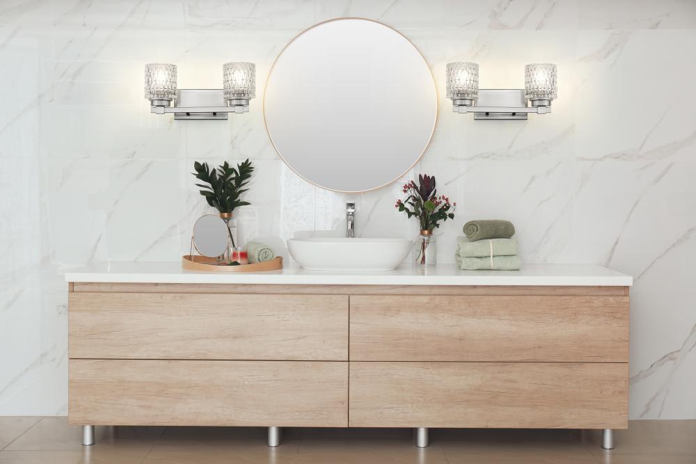 Crystal cut diamond patterning adds a textural quality to shades of this two-light vanity light, a decadent addition to bathrooms and outer living spaces. Timeless style features subtle detail on a brushed nickel finish steel frame, offering versatility and timeless design elements. Dim lighting to suit custom needs or create mood illumination.