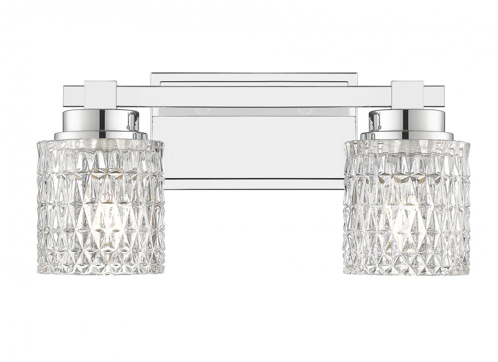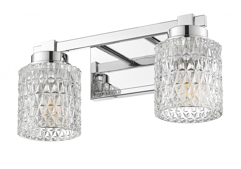 Glam comes in different forms, and this two-light vanity light brings it in tasteful measure to upscale bath spaces and open living areas. With the precision-cut diamond patterning on crystal-like clear glass shades, its shiny chrome finish steel frame is not to be missed. Enjoy alternate lighting to create mood illumination thanks to dimming functionality.