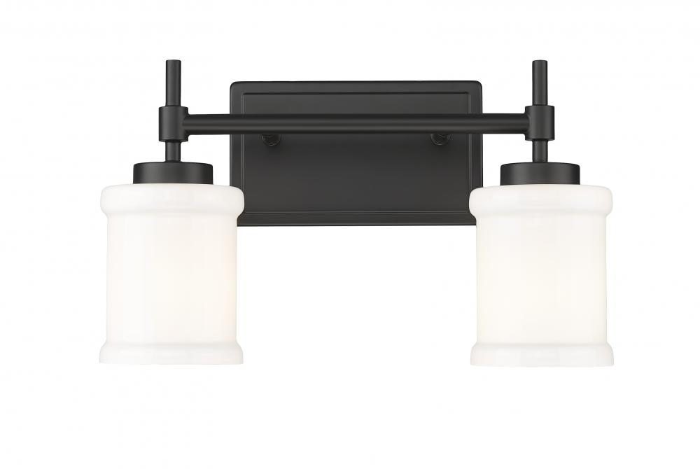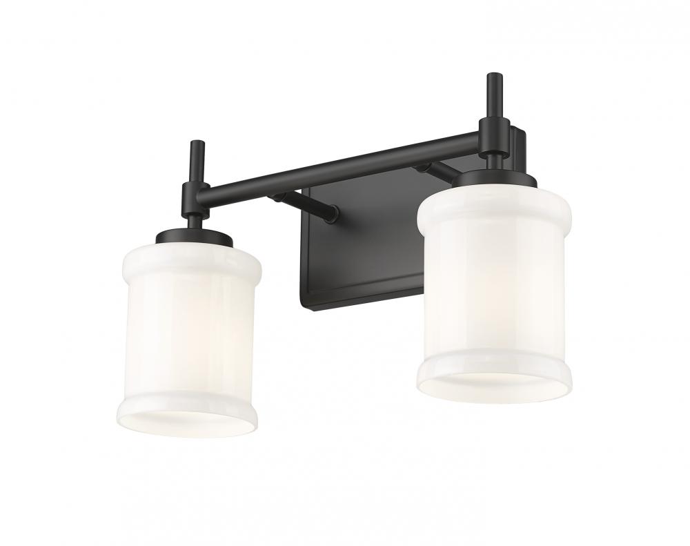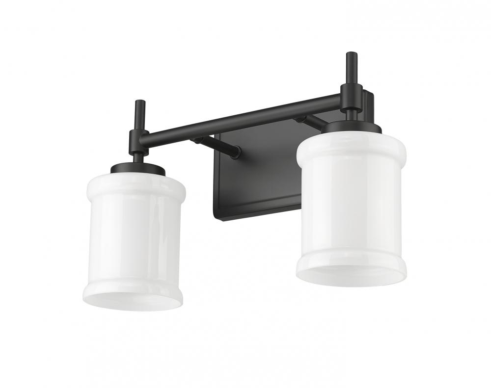 Matte black finishing contributes a sense of strength and gravitas to a modern two-light vanity fixture. Perfect for a bathroom remodel, it offers a trimmed wall plate and decorative arms, each hosting a cylinder of glossy white glass with cuff accents that add rich texture and depth.