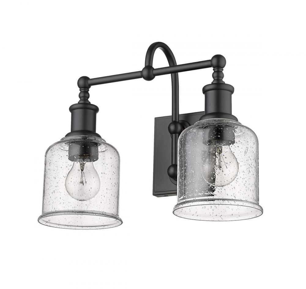 Choose a vintage industrial look with nautical influence, adding this two-light vanity light from the Bryant collection. Embrace a bold matte black finish steel frame and mount, contrasting beautifully with clear seedy glass shades. A curved arm, ornate holders, and lipped shades generate extra charm that stylize a custom bath space, dining area, or main living room.