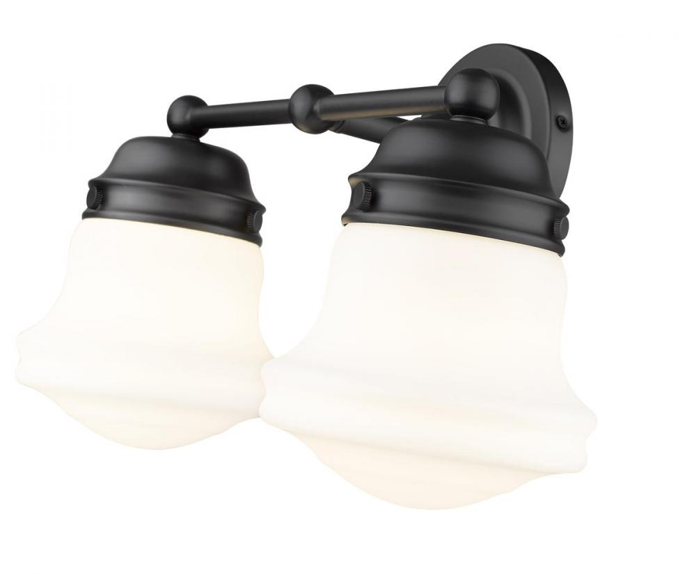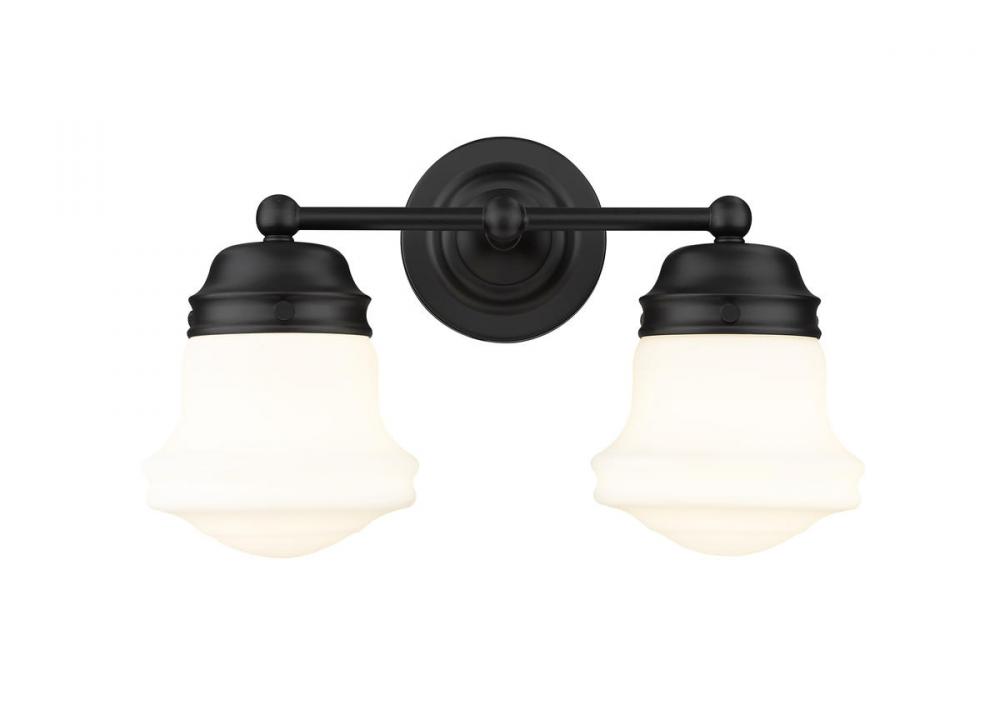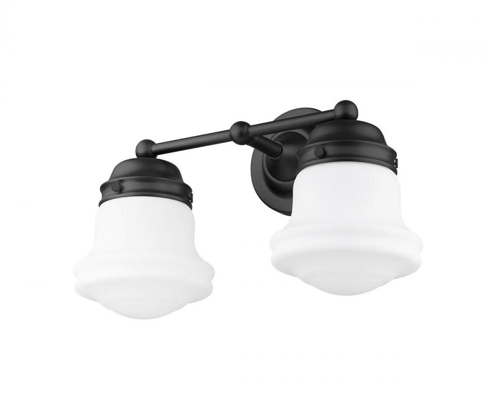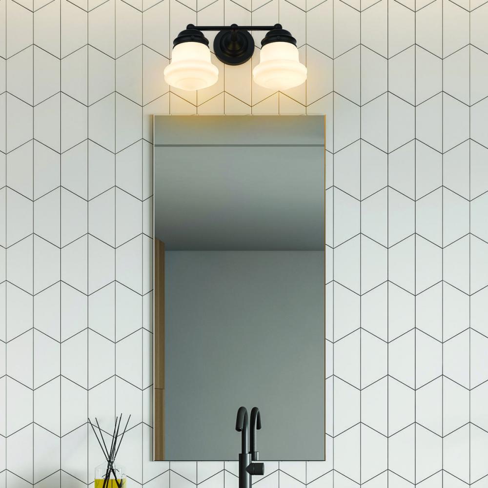 Charming, festive style goes light as it lights up a bath space with this two-light vanity from the Vaughn collection. Illuminate a compact vanity with a themed fixture borrowing from nautical and industrial, formed of matte black finish steel and featuring unique schoolhouse opal glass shades. This light becomes a central focus in a transitional or modern bathroom.