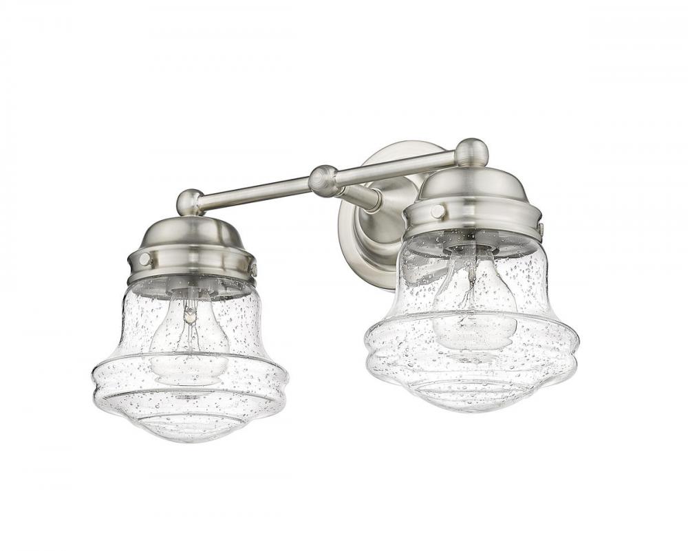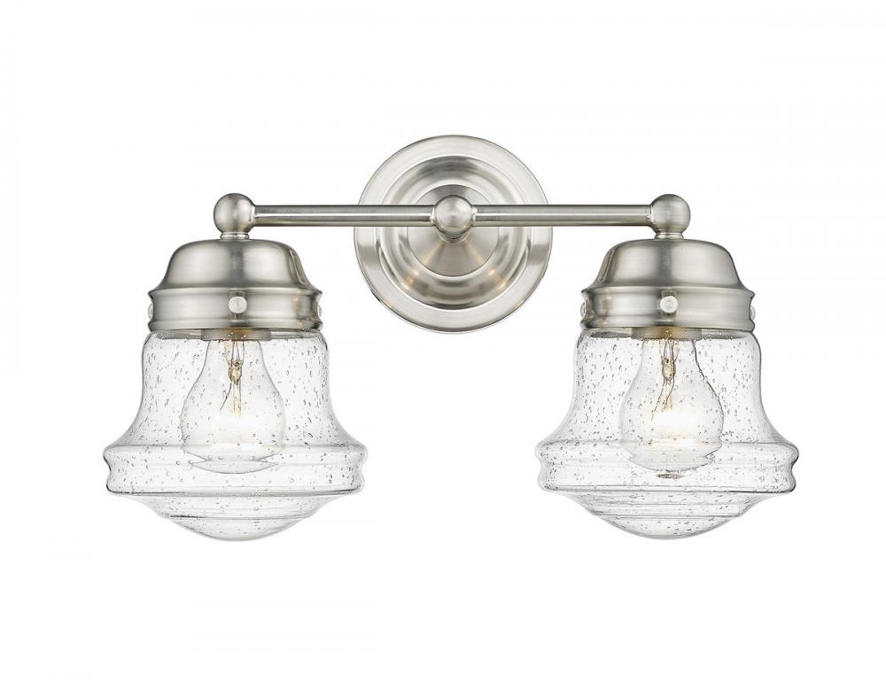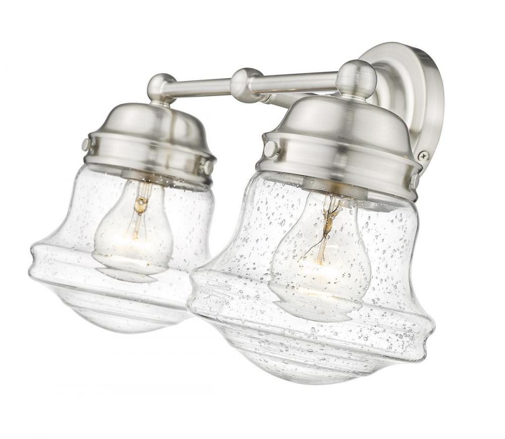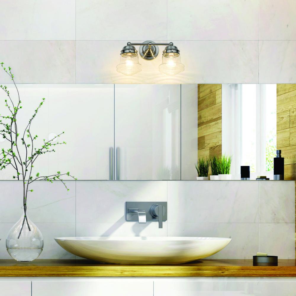 Charming, festive style goes light as it lights up a bath space with this two-light vanity from the Vaughn collection. Illuminate a compact vanity with a themed fixture borrowing from nautical and industrial, formed of cool brushed nickel finish steel and featuring unique schoolhouse clear seedy glass shades. This light becomes a central focus in a transitional or modern bathroom.