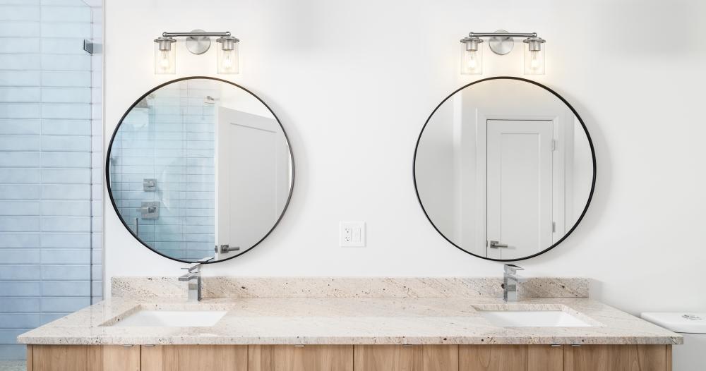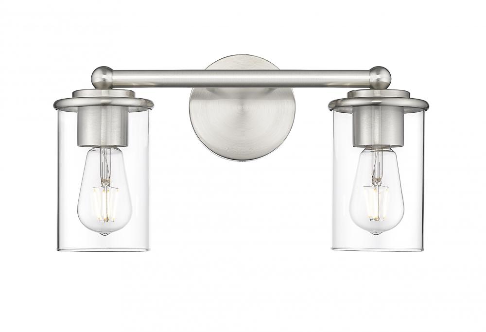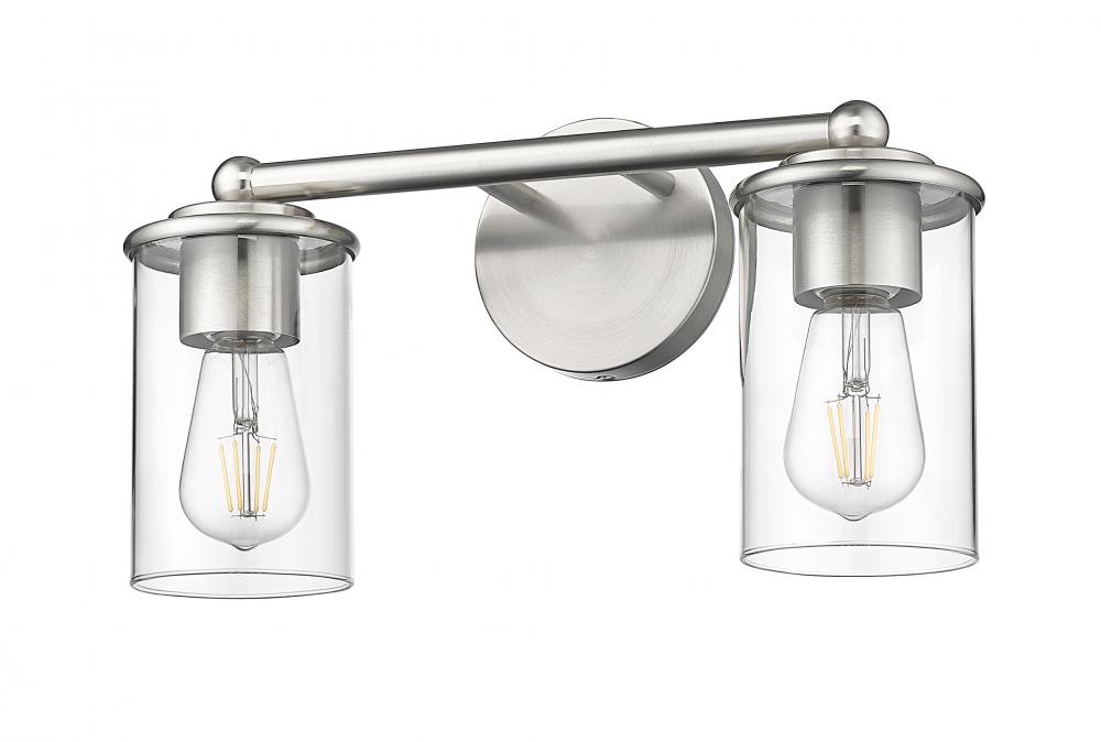 Introduce crisp, modern style and bright illumination over a vanity or in your bathroom with a contemporary two-light vanity fixture. Showcasing timeless design details, its frame receives a chic brushed nickel finish while clear glass allows full view of the bulb within, great for grooming and beauty rituals.