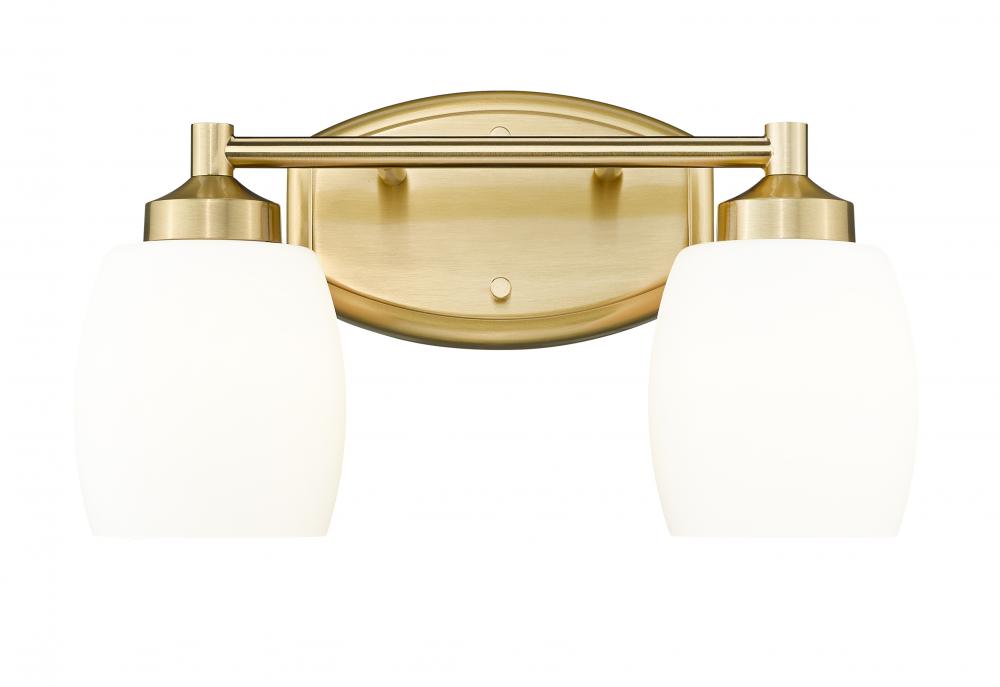 Deep luxe gold adds fresh sophistication to the compelling curves featured in this modern two-light vanity fixture. A straight arm decorates a rounded wall plate, while rounded shades in matte opal glass create soft illumination. Its the perfect choice over a bathroom vanity in need of an update.