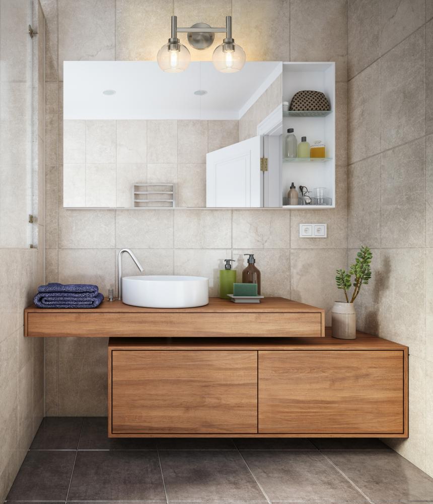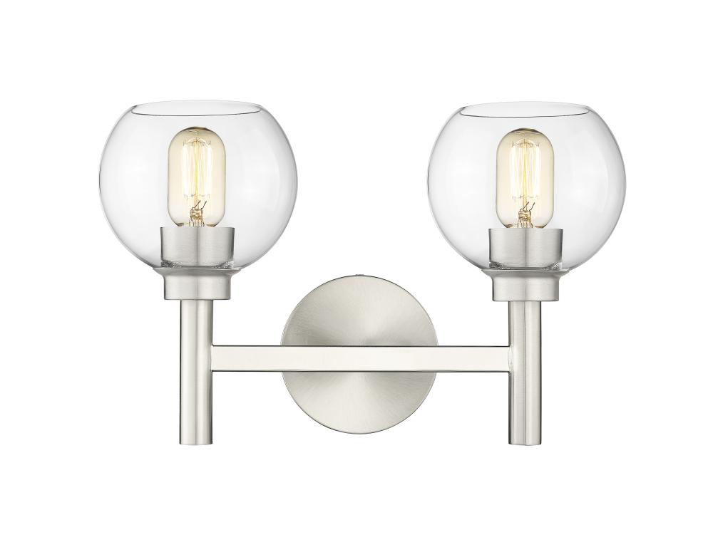 A contemporary two-light vanity sconce boasts graceful curves that create its perfect circle design elements. Its familiar, torch-inspired silhouette is adorned with a brushed nickel finish for gleaming flair in an entry or bathroom. A pair of open-edged, clear glass globe shades adds precision, and this fixture can be mounted with lights either up or down to best suit your space and preference.