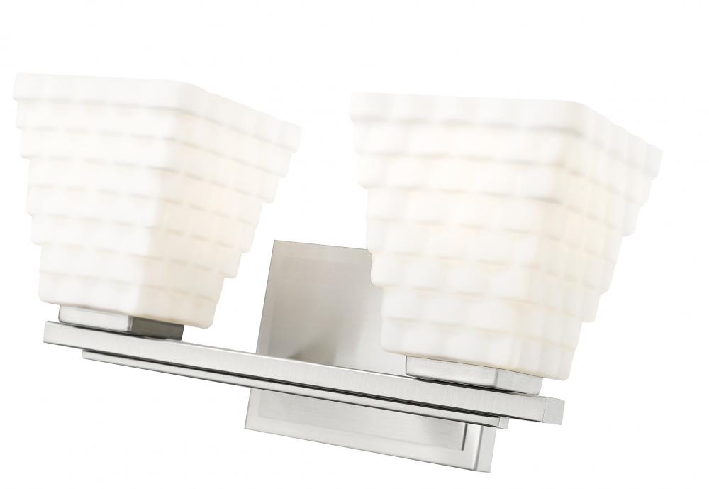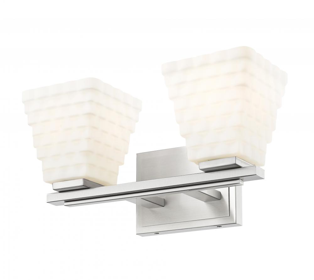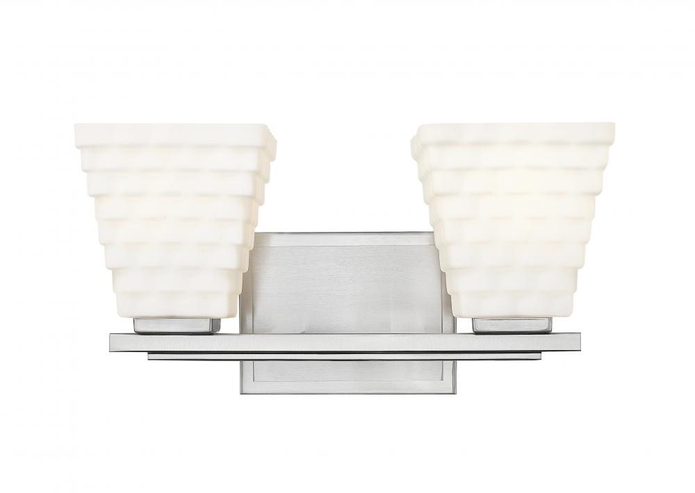 Cast bright, bold uplighting with the tapered opal glass shades featured on this modern two-light vanity bath light. From the Annalise collection, it boasts a brushed nickel finish back plate and arm, each complete with layered details that perfectly complement the artistic shade design.