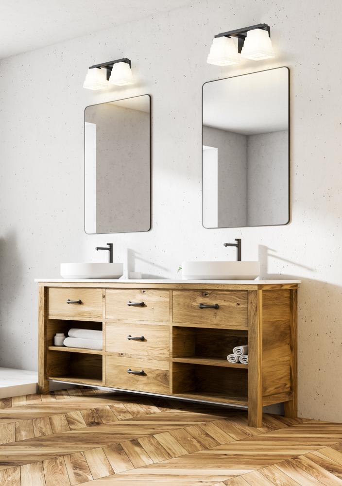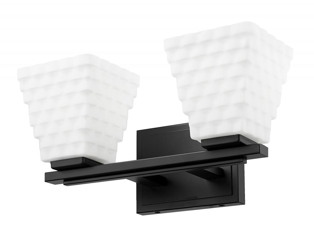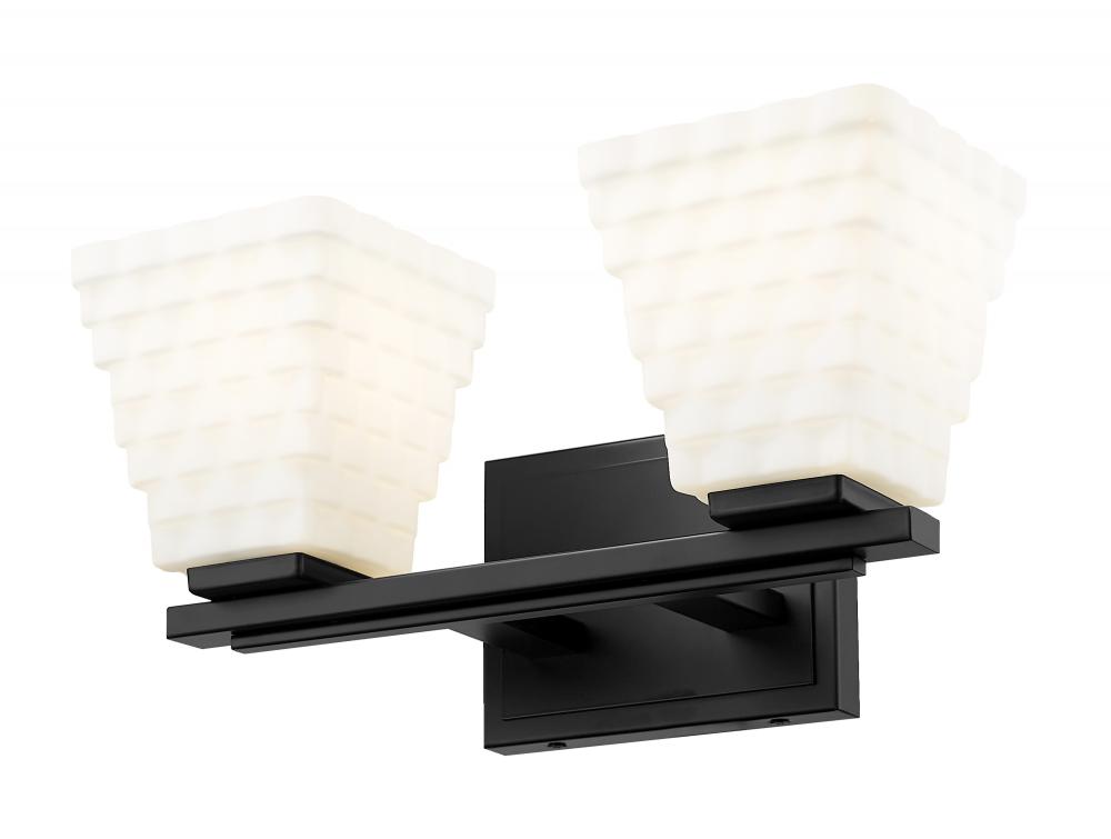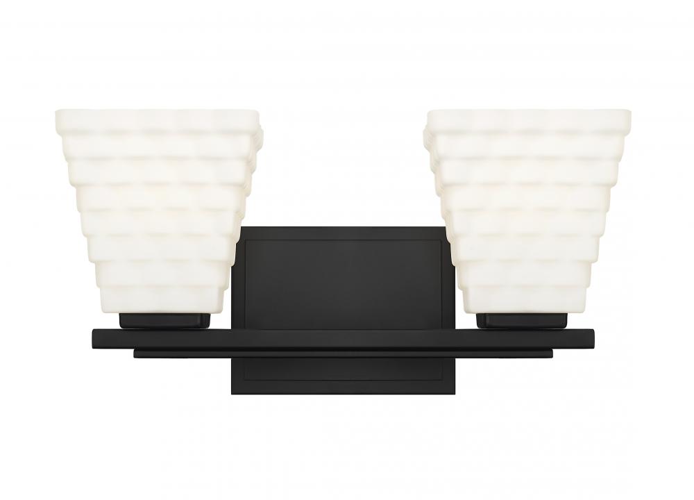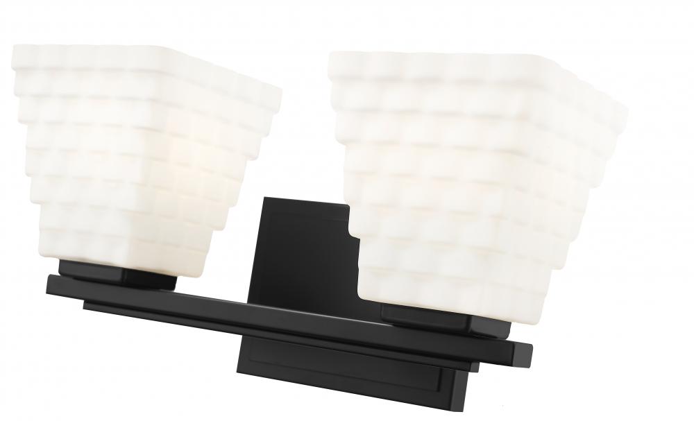 Create bold contrast with the dynamic matte black frame finish featured on this modern two-light vanity bath light. Impeccably designed, its backplate and arm offer understated layered details, perfectly complementing its shades. Each shade is fashioned in layered rectangular of opal glass, creating contrast and delivering bright illumination.