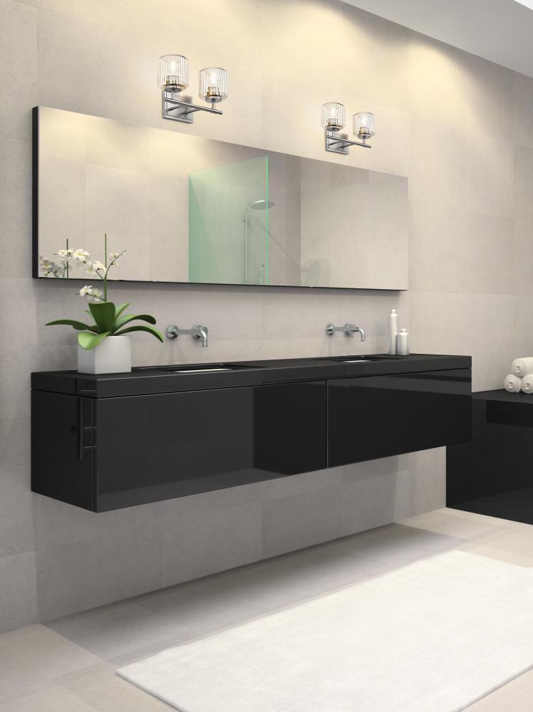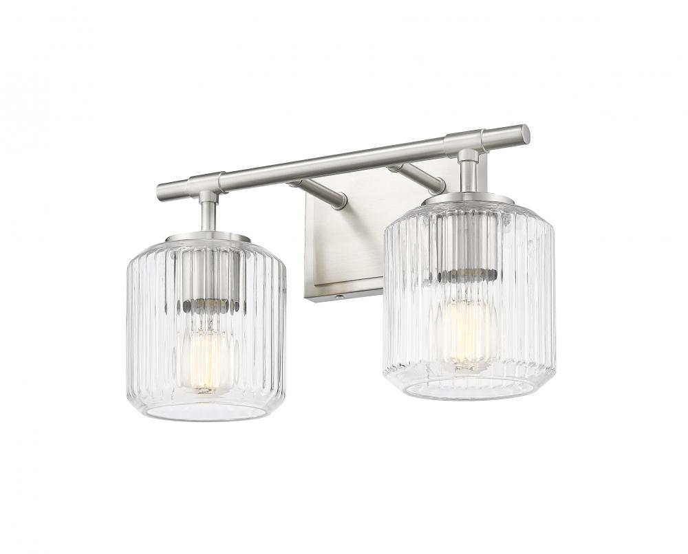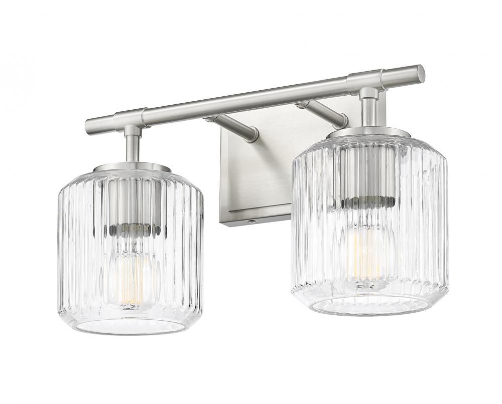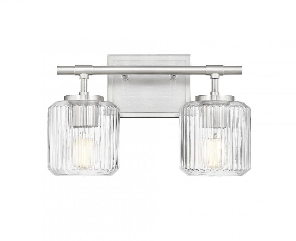 Sparkling ribbed glass creates a soft, undulating effect for this modern two-light vanity bath light. Beautiful in contemporary, transitional, and traditional settings, it showcases a simple wall plate and straight arms, all in a soft brushed nickel finish thats sure to complement in any setting.