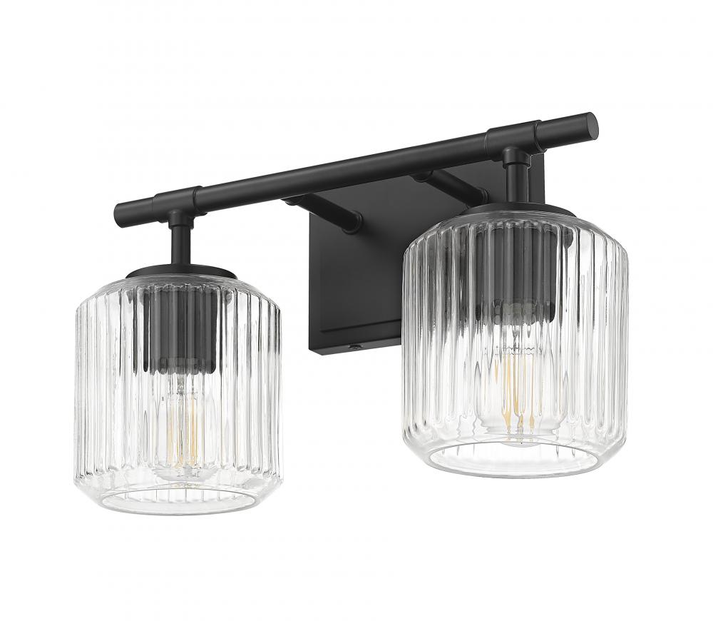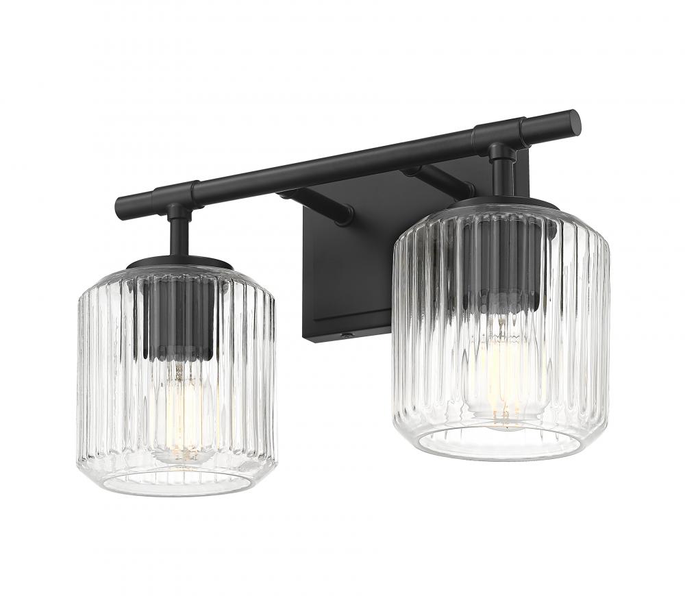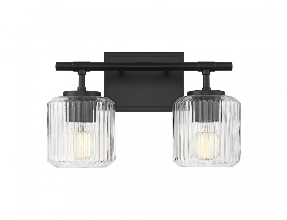 Augment contemporary or traditional design aesthetics with this modern two-light vanity bath light. A rich matte black finish rectangular wall plate and straight arms create contrast and depth, perfect for a variety of bath settings. Ribbed clear glass shades sparkle and seem to undulate when illuminated, adding depth and sophistication.