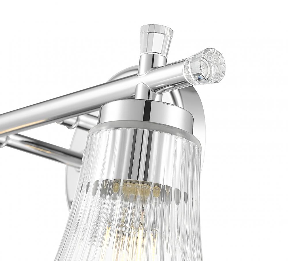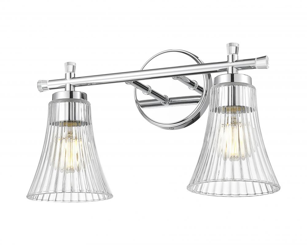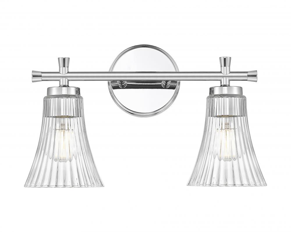 With its mirror-like chrome finish and sparkling fluted silhouette, this two-light vanity fixture is pure charm. Clear glass shades catch and reflect the light with graceful curves that feel both vintage and fresh. It?s a beautiful choice for creating a bright, boutique-style bath.