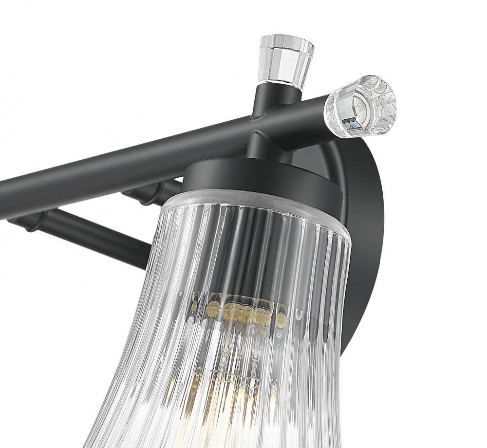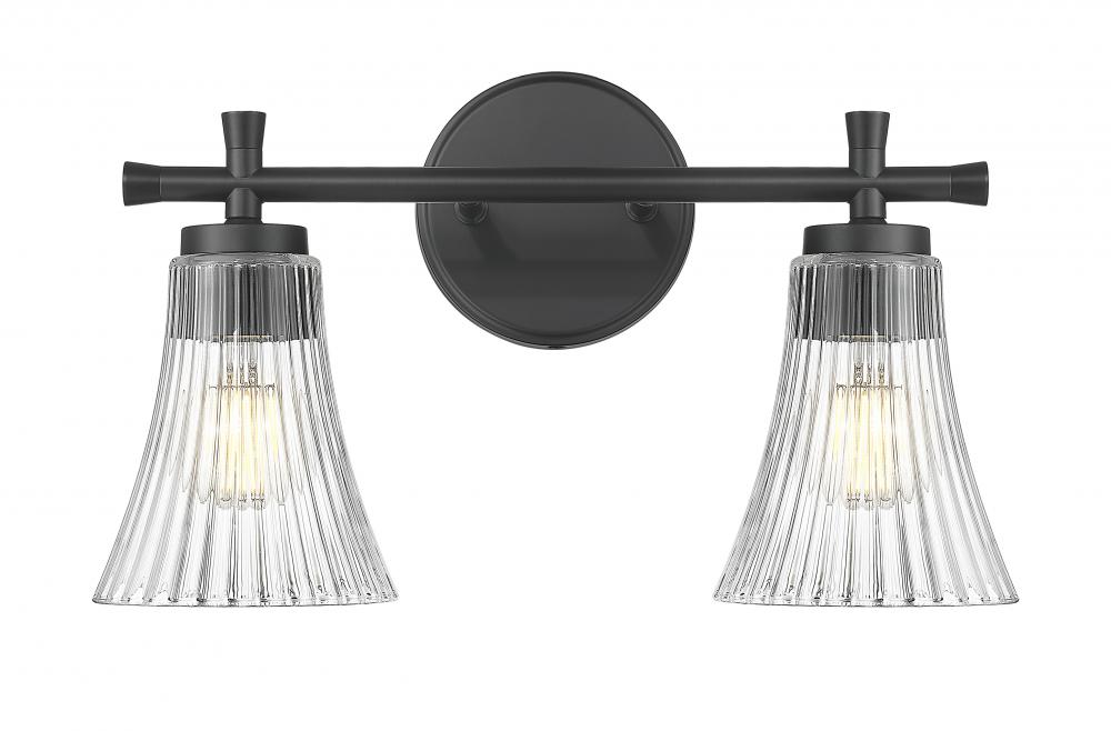 Bring drama home with this two-light vanity fixture that pairs a matte black finish with fluted clear glass for a look that?s bold, refined, and a little romantic. The crystal-like shades bring unexpected softness, striking just the right contrast. It?s perfect for a space that wants character without compromise.