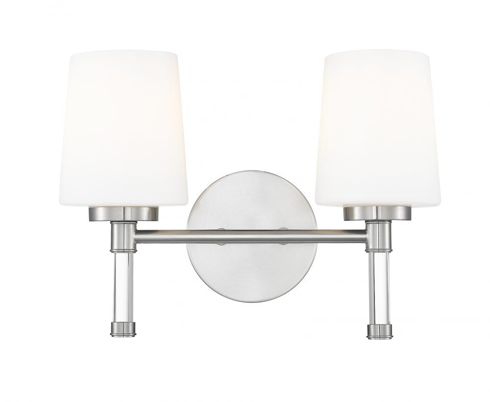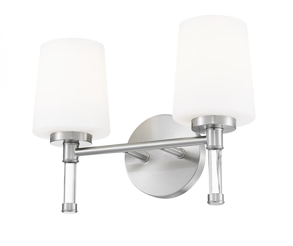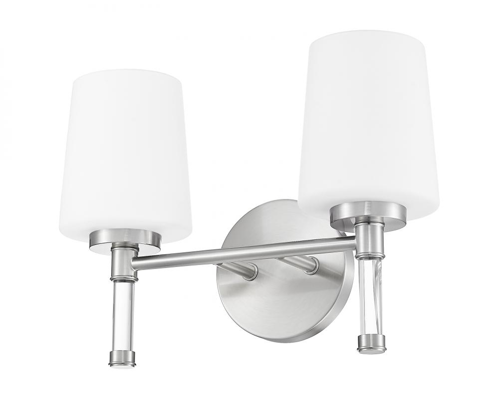 Stretching gracefully across the wall, this brushed nickel two-light vanity light brings twin opal shades that balance a wider mirror and keep both sides of the sink evenly illuminated. The crisp metal bar and delicate crystal accents create a look that feels at once tailored and airy, making it just as at home in a shared family bath as in a refined primary suite. Dim the bulbs for a relaxed spa-like soak or turn them up for energizing morning light, and this adaptable piece supports every mood the room needs to hold.