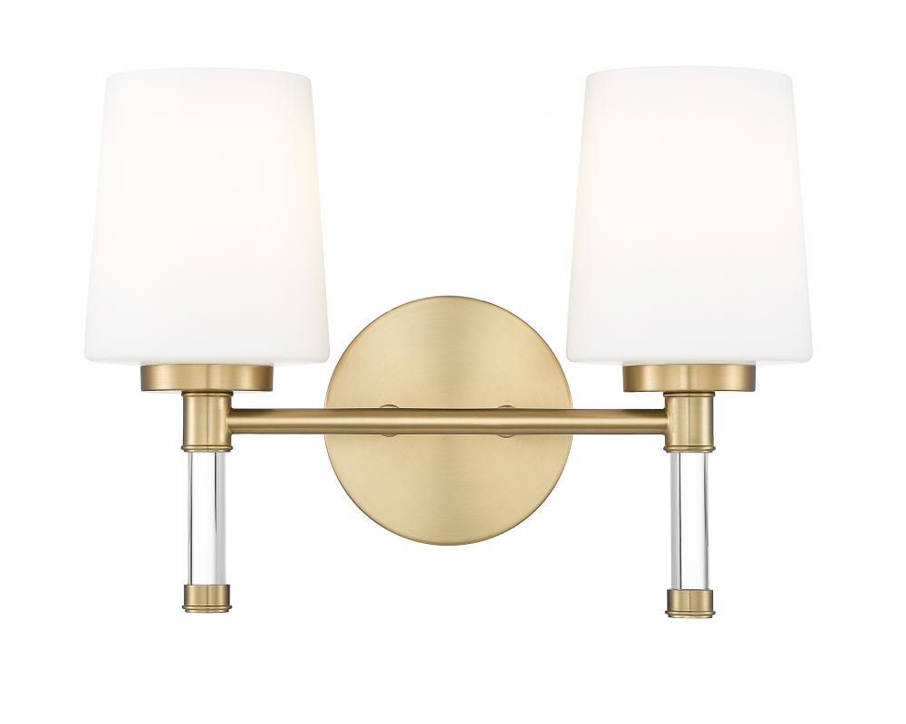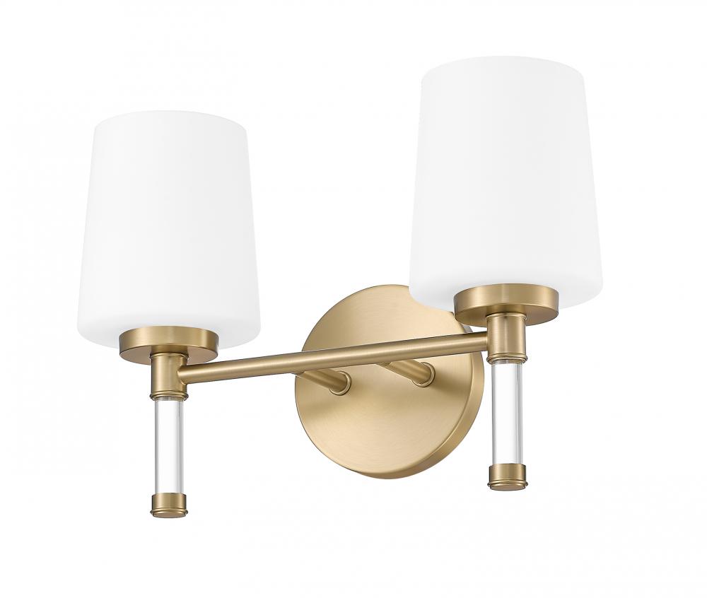 Softly brushed metal finishes lend this modern gold two-light vanity light a warm, sunlit character that flatters tile, stone, and paint alike. The pair of opal glass shades glow like small lanterns, sending an inviting light across the sink that feels especially welcoming in guest baths or a dressing nook. Paired with warm hardware and plush towels, this graceful fixture helps the room feel collected, gracious, and ready for everyday rituals or special evenings.