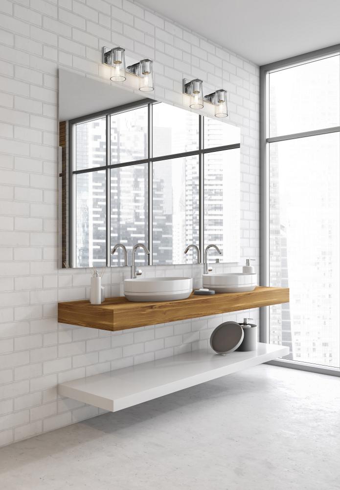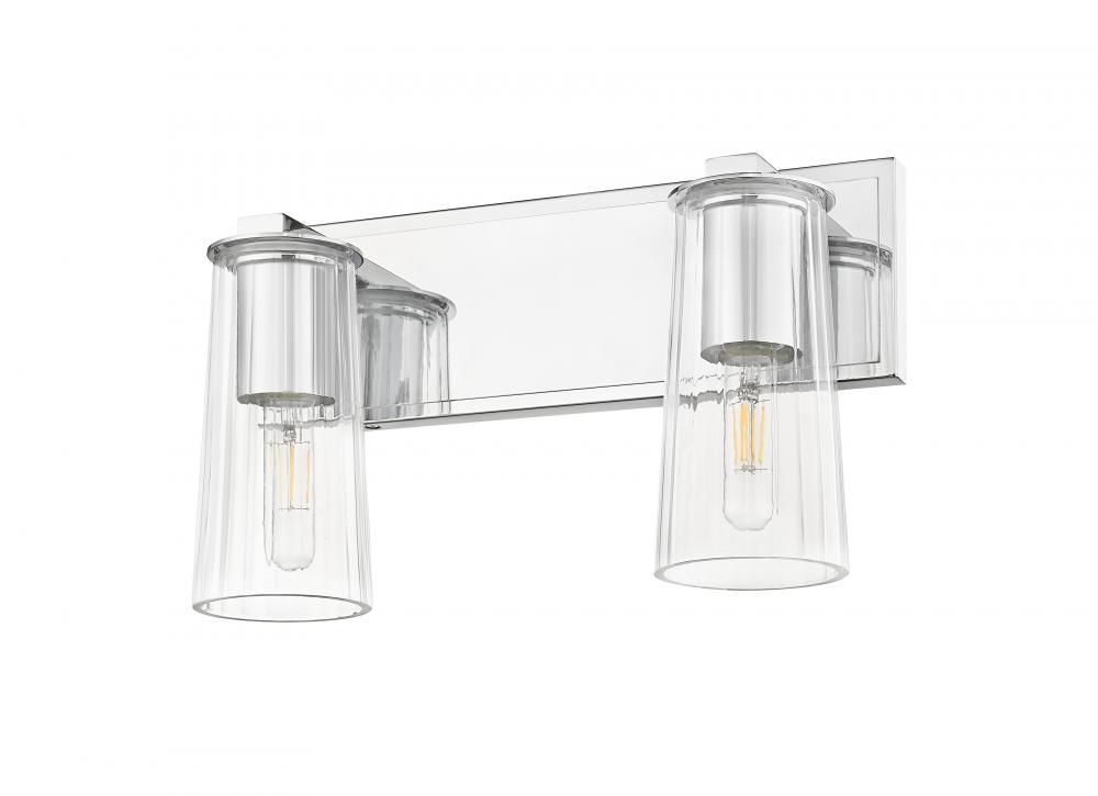Industrial character infuses a modern two-light vanity fixture. Its chrome finish adds contemporary appeal, while tubular bulbs add vintage character. They tuck within clear tapered glass shades, offering bright illumination and charming style to your vanity.