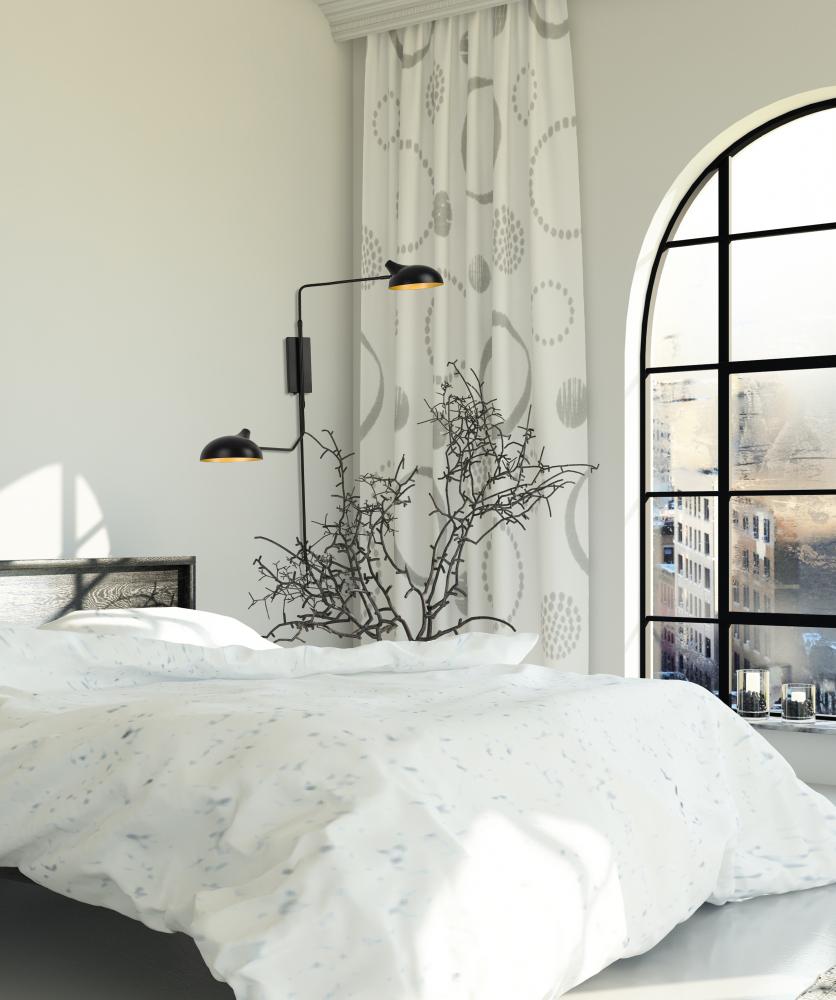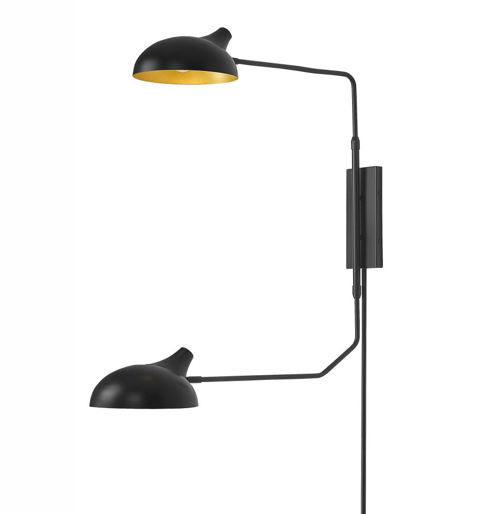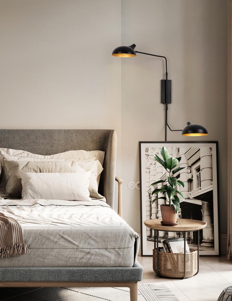 A playful silhouette invokes Mid-Century Modern design elements in a fixture ideal for creating an artful look in a bedroom or living space. This two-light linear light from the Bellamy collection stands out with a whimsical angled design positioning black steel shades and rods that make ambient light glow below. Lush gold finishes in the shades? interiors add a dose of glam to a simple yet stylish light.