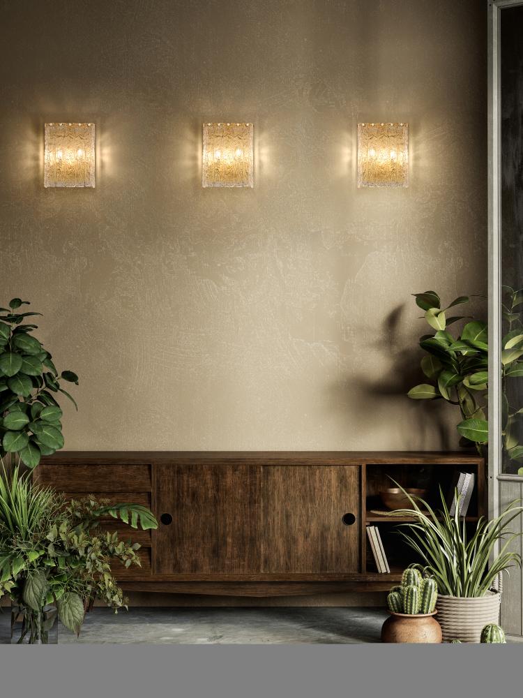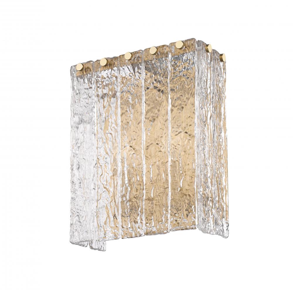 Highlight a contemporary primary or guest en suite with the icy sophistication of this modern two-light wall sconce. In a modern gold finish over its steel frame, the sconce imparts richness and warmth. Its clean vertical silhouette is defined with icy texturing over clear glass panels, diffusing light and creating a bold look and feel.