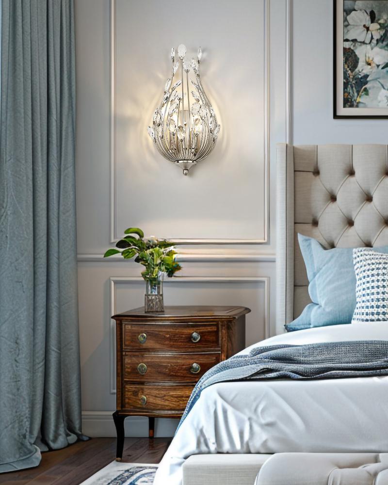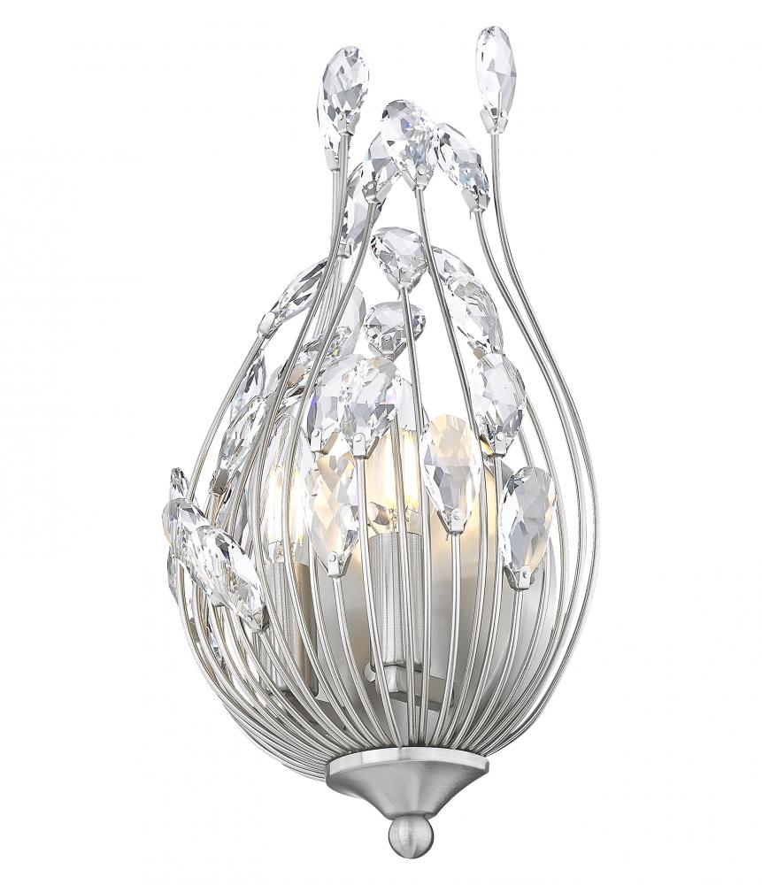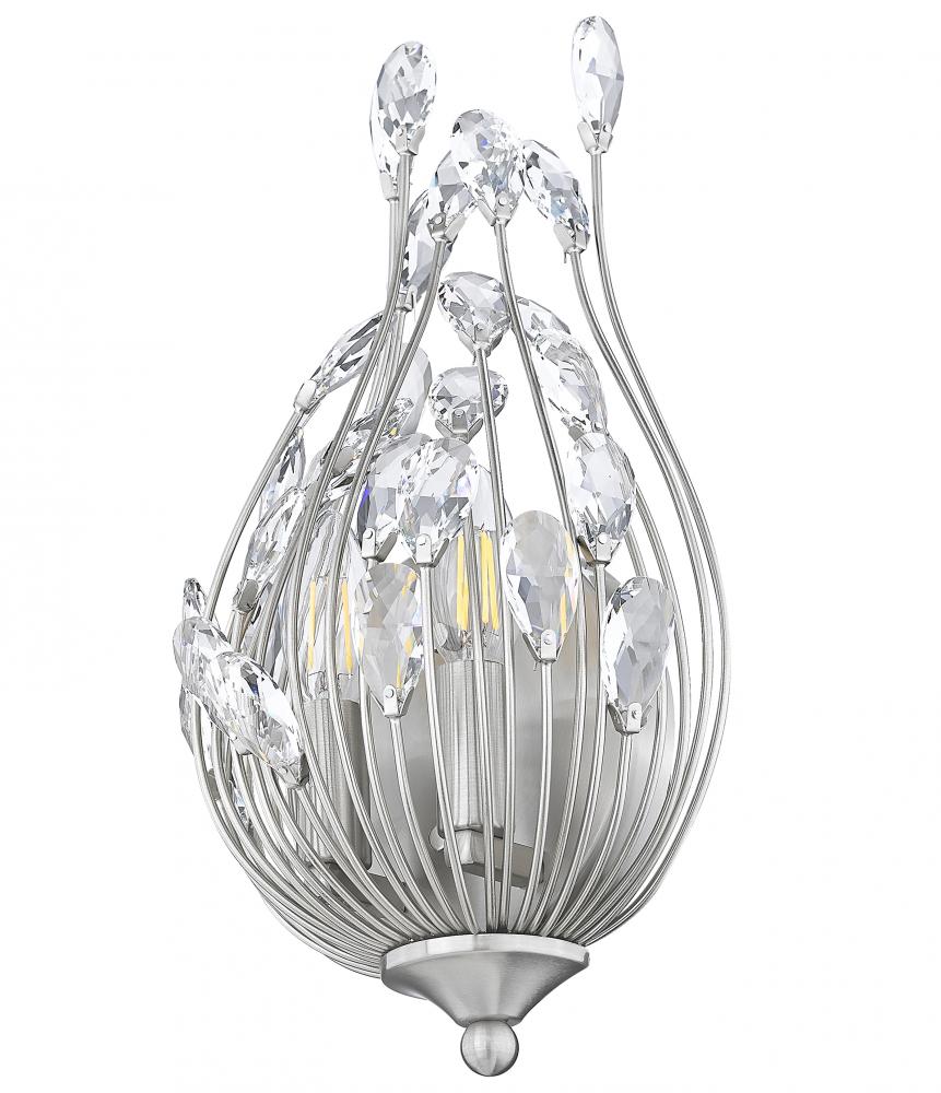 Achieve an artisan botanical motif in lighting with a two-light wall sconce offering a delicate look with a luxe brushed nickel finish. Sculpted silhouetting of open metalwork emulates vining, dressed up with sparkling crystal elements. This light fixture exudes an airy look in living rooms, bedrooms, and hallways.