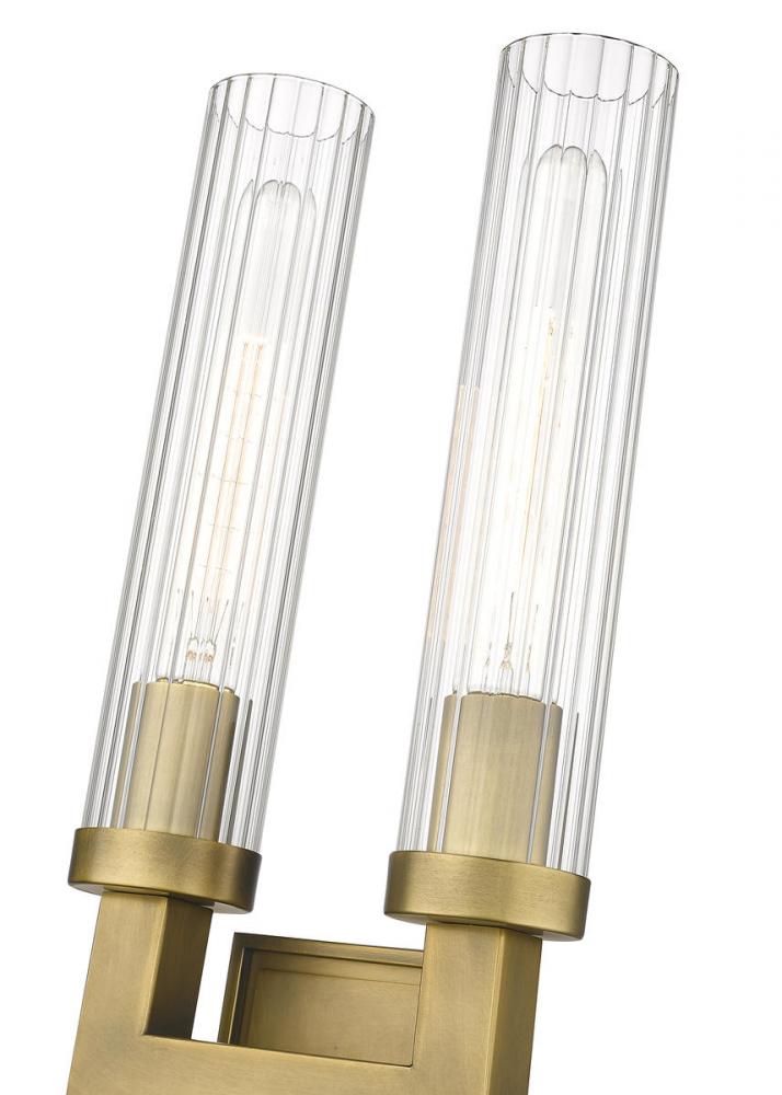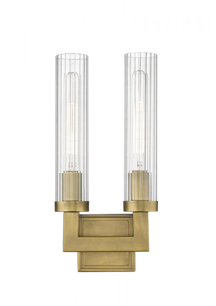 Add effortless sophistication to transitional or modern d?cor with this elegant, two-light wall sconce. With a strong steel frame in a rubbed brass finish and two elegant, textured glass shades, this fixture adds inviting ambiance to hallways, stairwells, and more.
