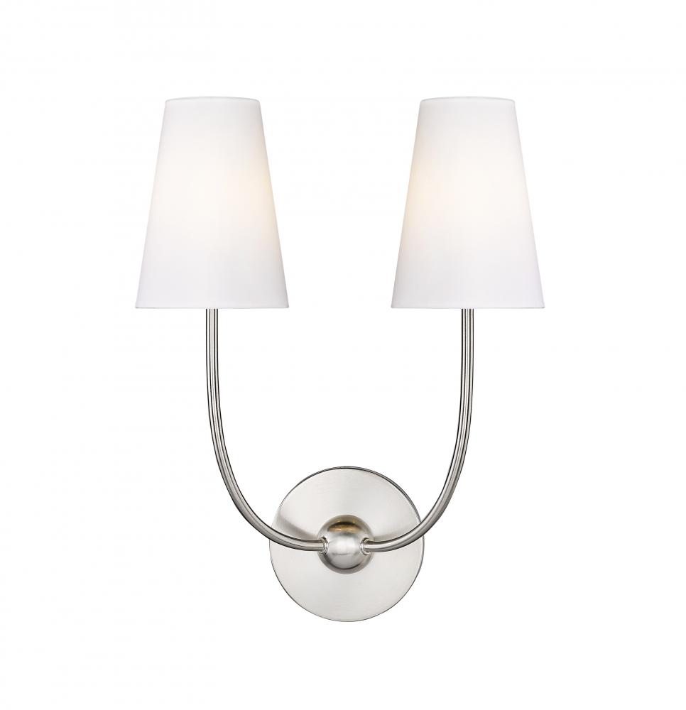 Graceful curves tell an artisanal story of a light fixture adding superb style to a living room, hallway, or dining space. This two-light metal wall sconce from the Shannon collection simplifies elegance with a minimalist brushed nickel finish steel frame and tall white fabric shades. Add this sconce to tie together surrounding d?cor and accents.
