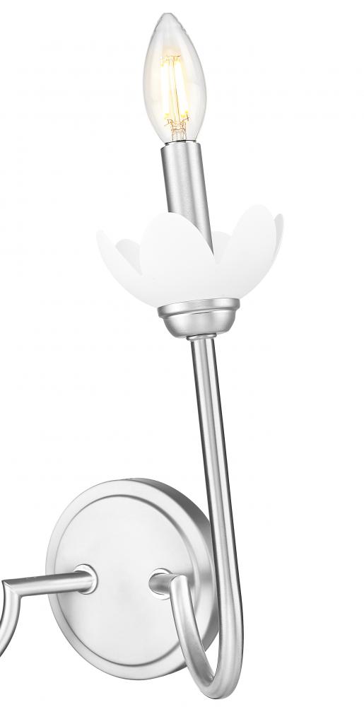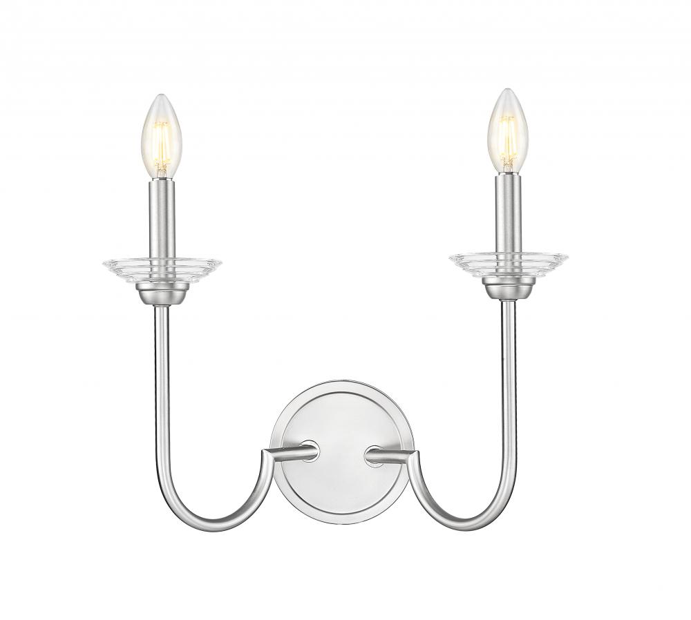 Elongated arms and charming flower petal bobeches create captivating style for this transitional two-light wall sconce. Beautiful in any setting, it features a brushed nickel finish with contemporary appeal and offers a refined touch with white metal and clear glass interchangeable bobeches.