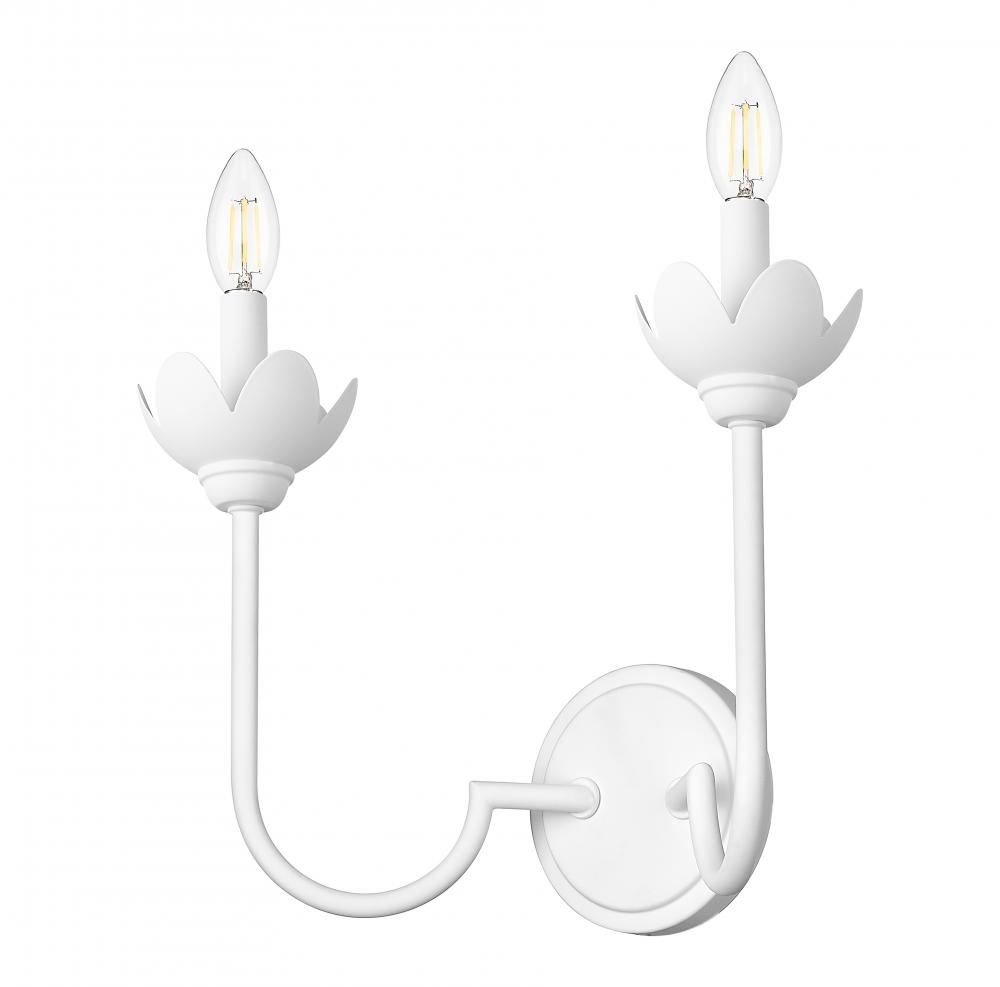 A cool textured white finish lends cottage core flair to this transitional two-light wall sconce from the Allistair collection. Floral bobeches, offered in interchangeable white metal and clear glass, add vintage botanical energy to this charming design, which is right at home in a bath, bedroom, or living area.
