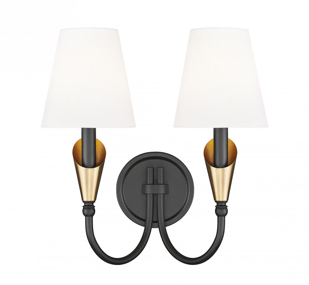 This two-light sconce makes a quiet yet striking statement, pairing modern gold with a matte black finish in a timeless silhouette. The curved arms hold glowing white shades, creating an inviting ambiance. Ideal for hallways, bedrooms, or anywhere that deserves a touch of charm.
