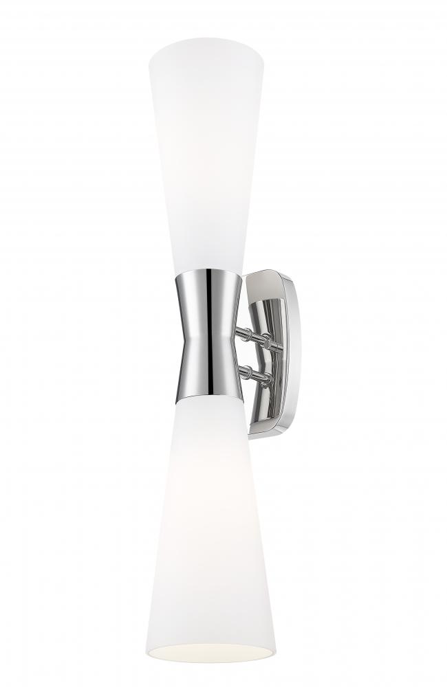 A versatile look is both elegant and chic in a two-light wall sconce blending glass and metal, a classic mix designed to flatter any space. This fixture features polished nickel finish steel framing, including a cinched center holder and shapely wall plate. Inverted matte opal glass tapered shades show off an exquisite addition to a classic design, emitting dimmable illumination to create mood lighting or customizing levels to suit an occasion.