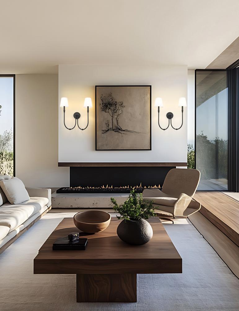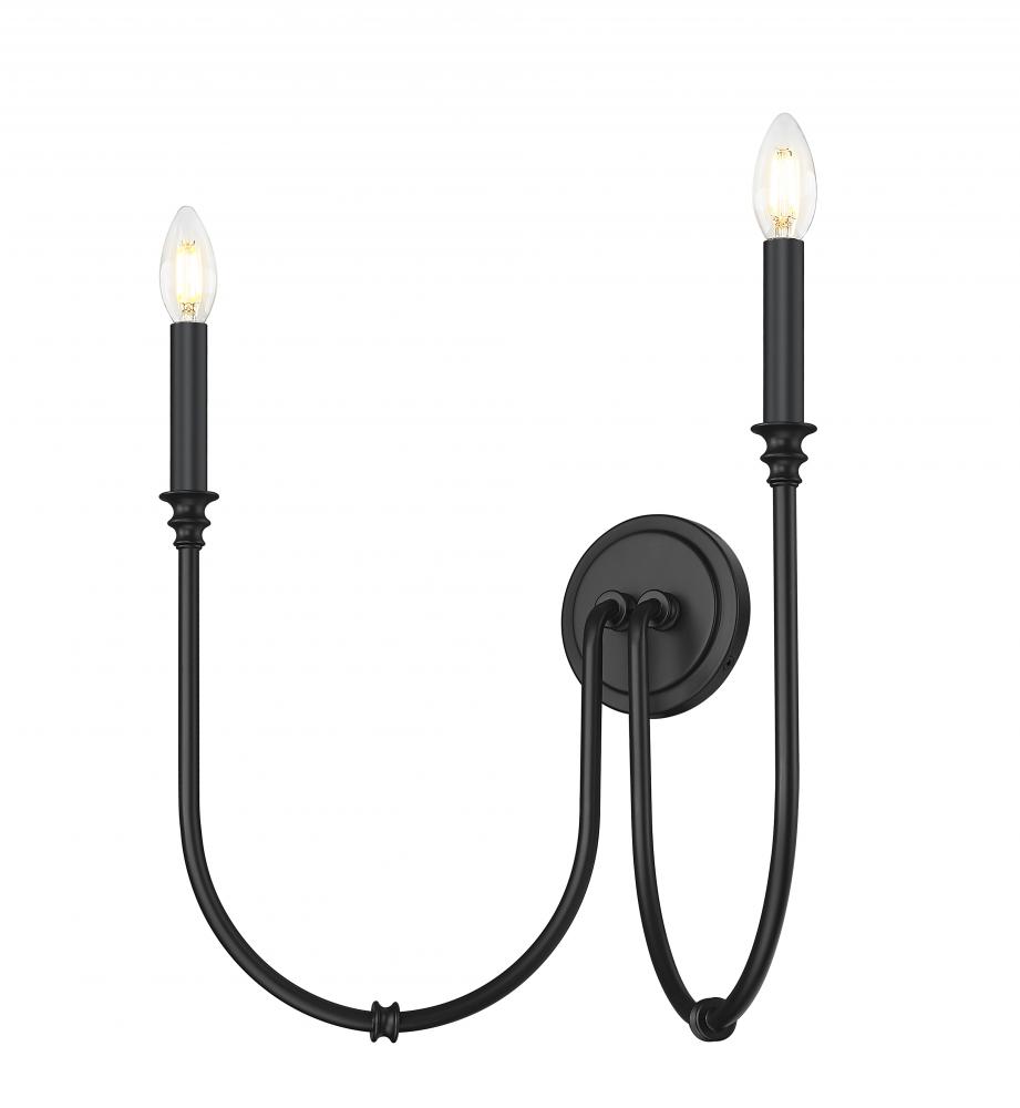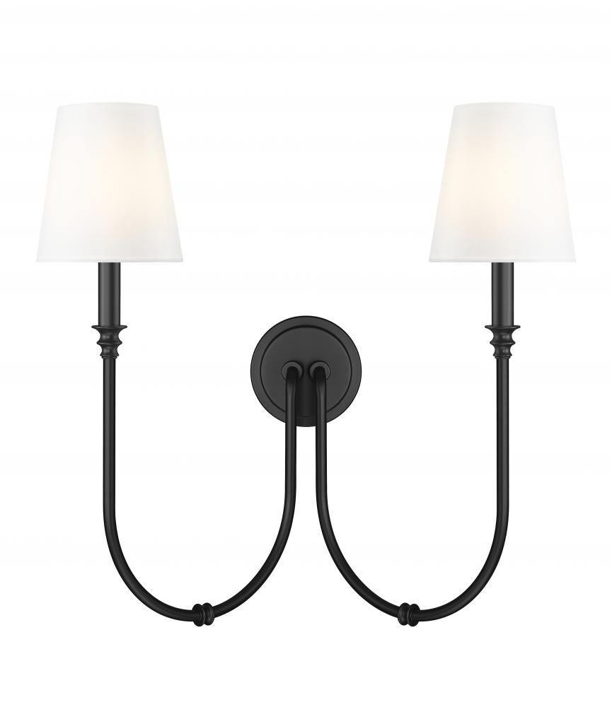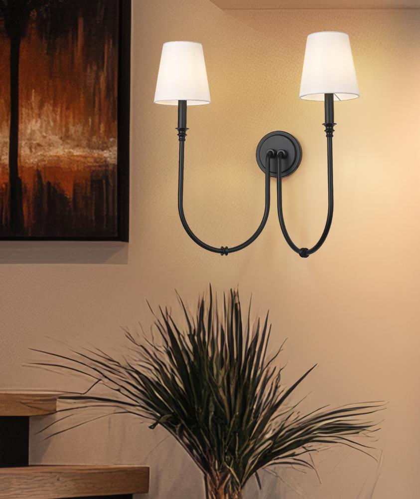 The silhouette factor of this two-light wall sconce plays a key role in its simple yet elegant style. Drama ensues in a fixture featuring matte black finish steel with a pair of deeply curved arms capped with charming candelabra holders. Classic linen shades reflect a timeless design suited to living rooms, bedrooms, and entryways.