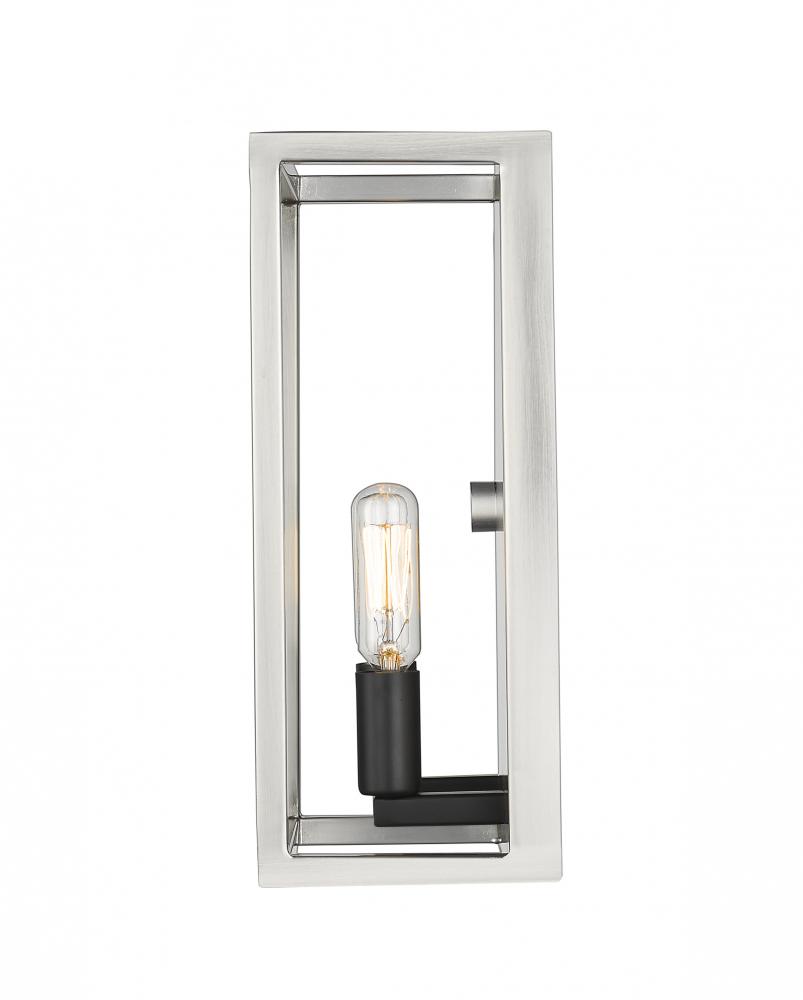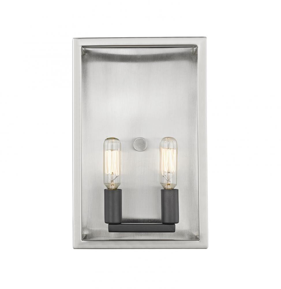 Clean, modern lines dominate the aesthetic of this captivating two-light wall sconce. With a stylish two-tone finish in brushed nickel and black, its geometric-influenced body enhances the charming effect of candelabra-style bulb bases.