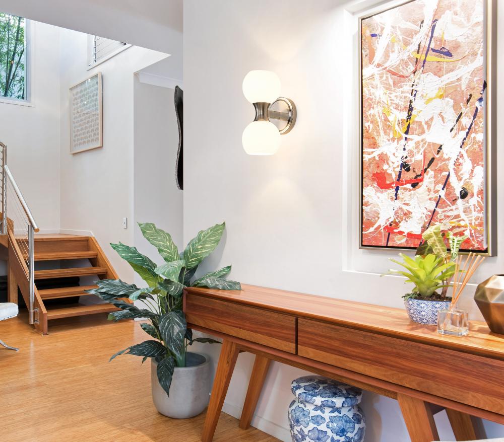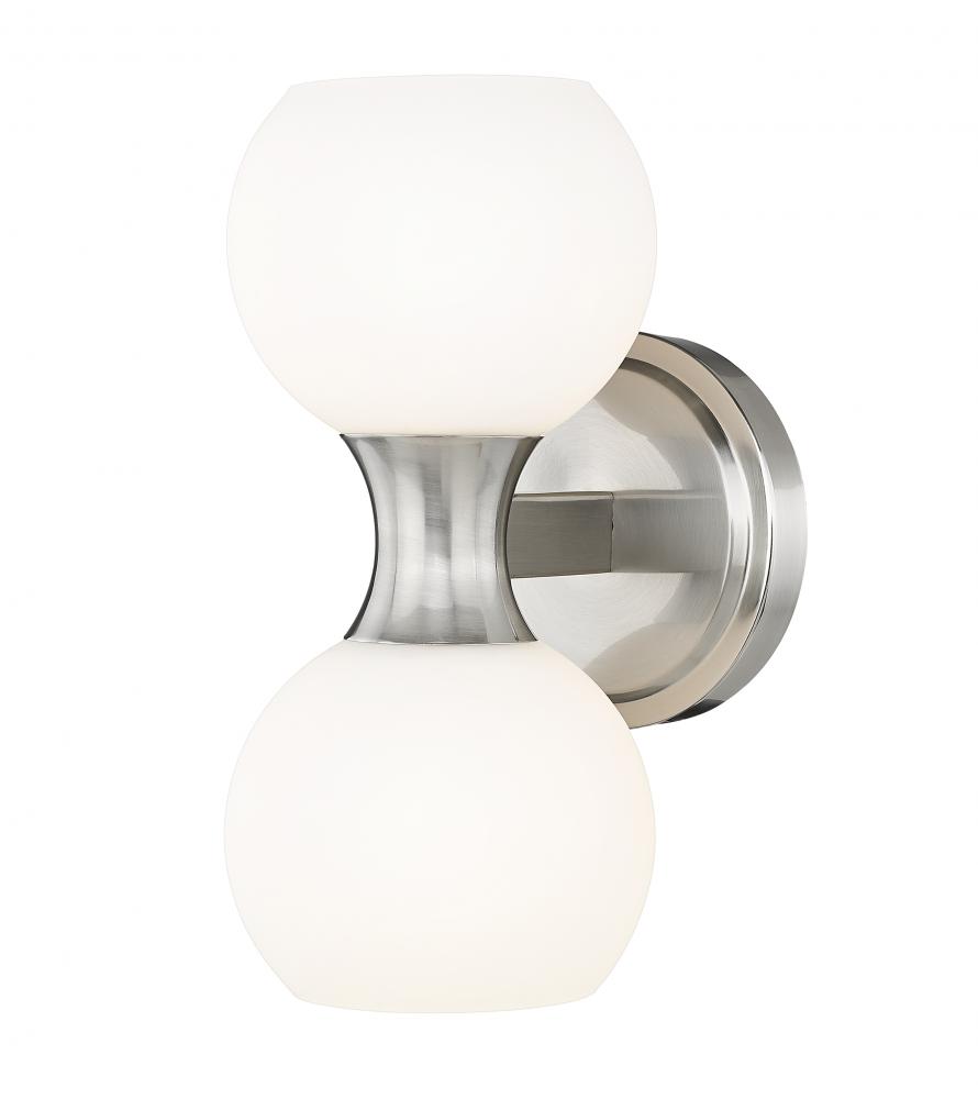 Simplicity turns modern and elegant in a Mid-Century Modern influenced design reflecting careful styling and adding a double dose of soft illumination. This two-light wall sconce from the Artemis collection makes good use of circular silhouetting, placing charming matte opal glass globe shades in a stacked fashion, as a brushed nickel finish steel frame delivers versatility and a gleaming quality ideal for a bath space or main living area.