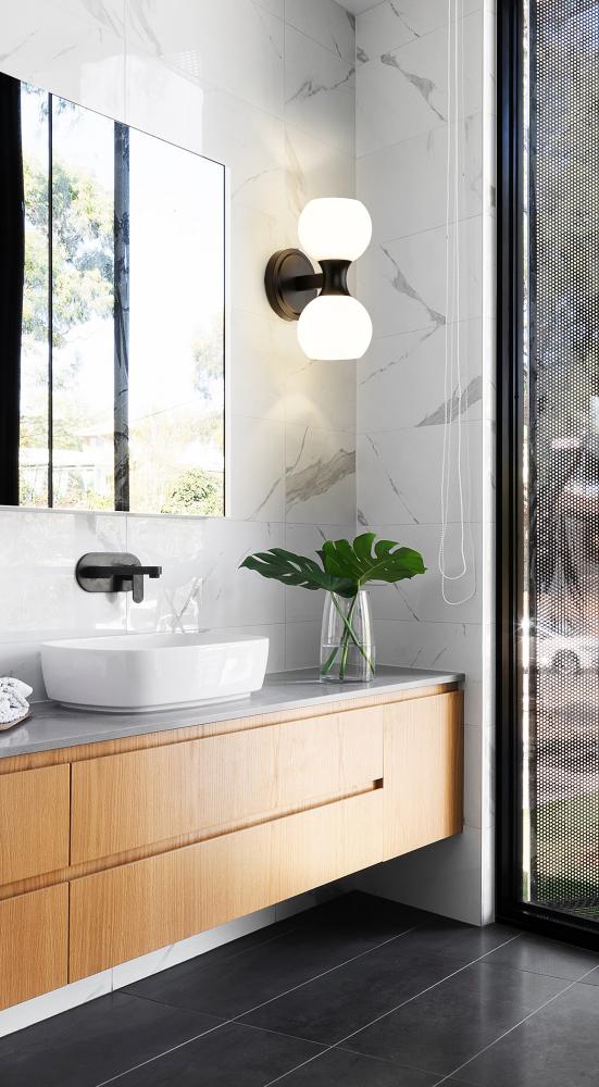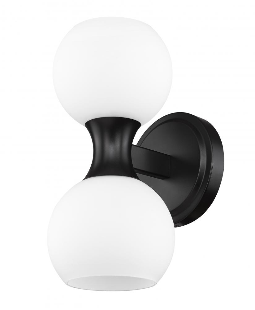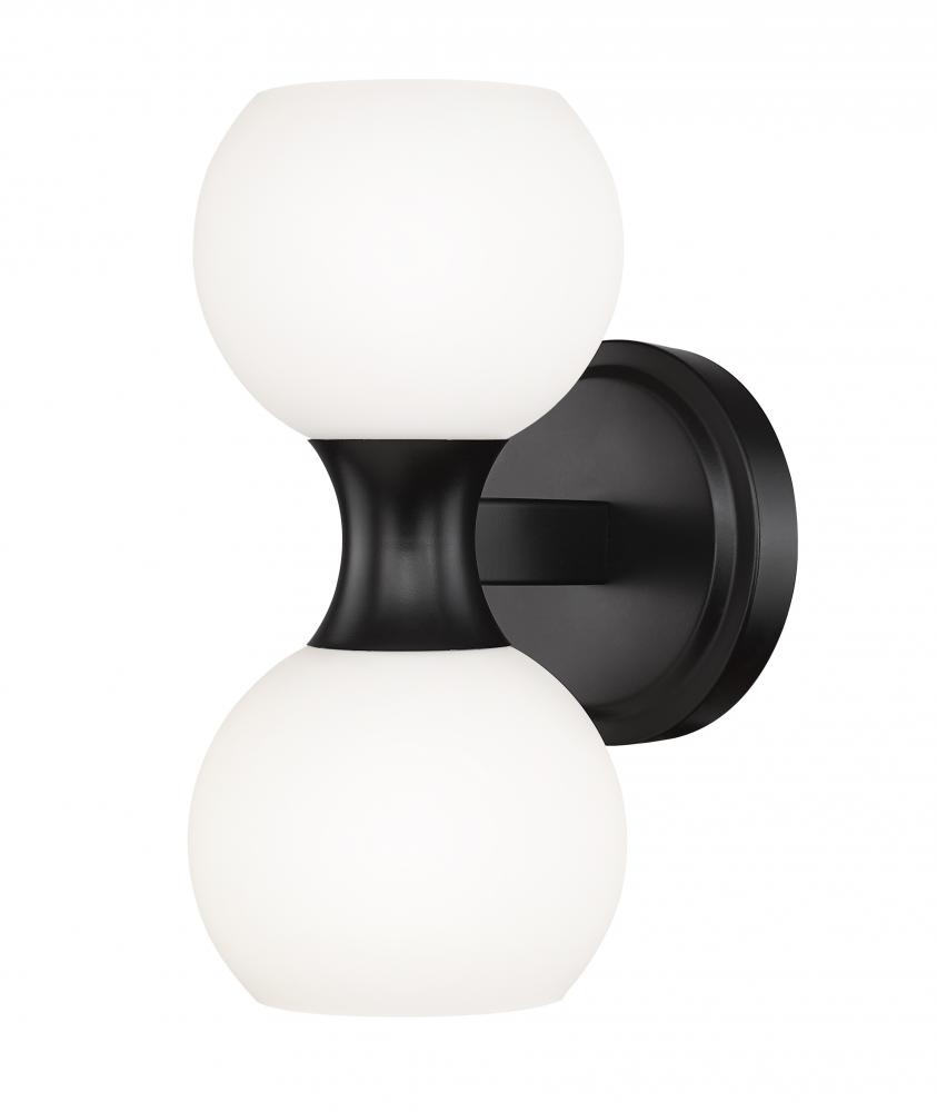 An iconic Mid-Century Modern vibe and a crisp contrasting finish palette deliver unforgettable character directing a new approach to lighting as d?cor. This two-light wall sconce from the Artemis collection makes good use of circular silhouetting, placing charming matte opal glass globe shades in a stacked fashion, as a matte black finish steel frame delivers a bold look and a festive aesthetic ideal for a bath space or main living area.