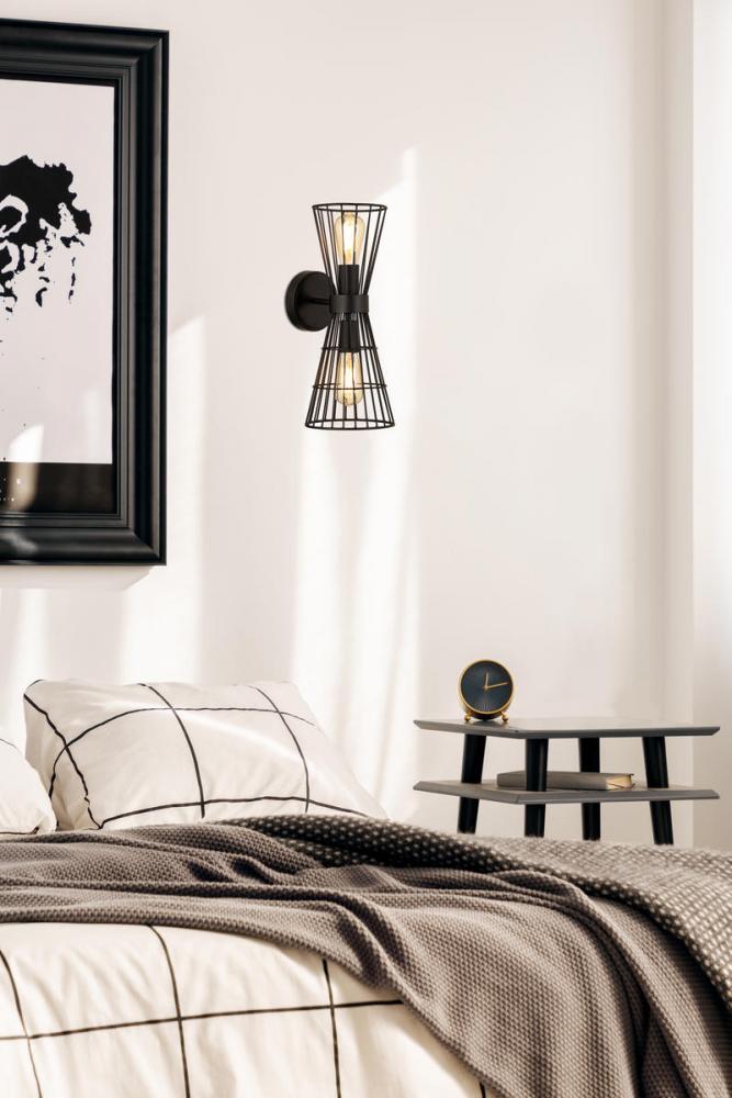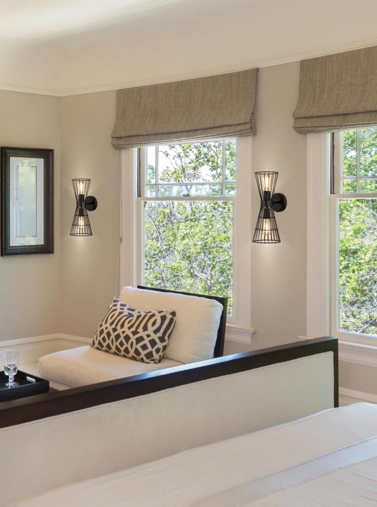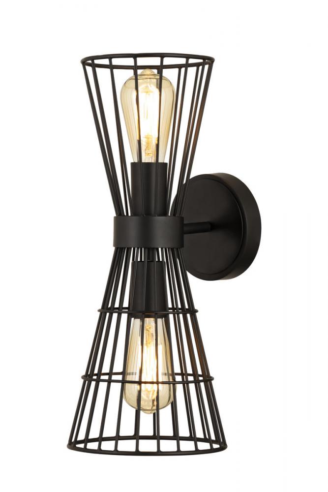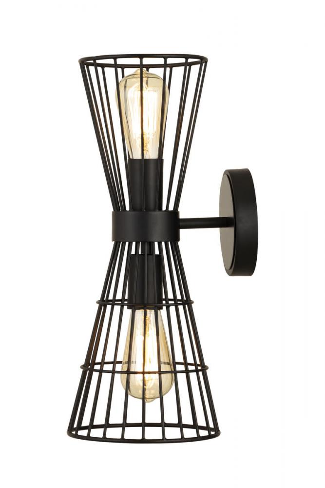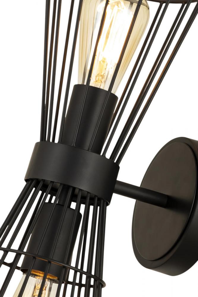 A cage-like design offers a hint of industrial inspiration to this energizing two-light wall sconce, a superb choice for a custom casual space. Light up a hallway, bathroom, or bedroom with this sconce offering geometric elegance in a concave silhouette and thin wires made of matte black finish iron. Adding separately purchased vintage style bulbs changes up its motif to reflect versatility.