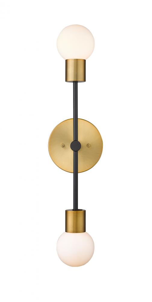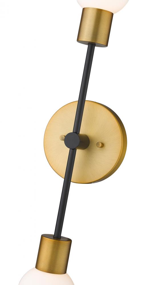 This stylish two-light wall sconce from the Neutra collection lends a mid-century modern flair with a subtle Art Deco vibe. Ideal for a contemporary master suite, this dual pendant wall sconce features a steel structure, complete with polished foundry brass and matte black finishes. In addition, this wall sconce lends a soft, soothing glow with its two stacked opal globes.