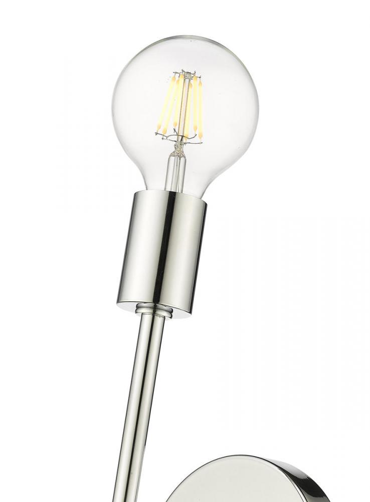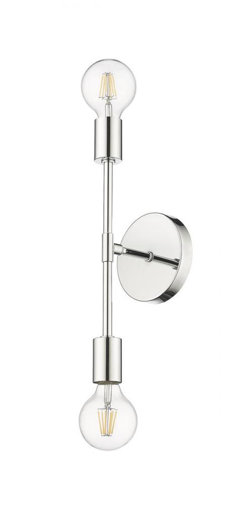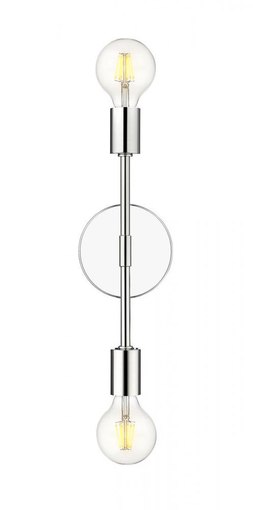 The lustrous character of chrome finish steel shines brightly, bringing a notable quality to this two-light wall sconce. From the Modernist collection, this contemporary sconce delivers a sleek linear design with a vertical frame hosting bulbs at each end, and a round wall mount offering visual balance.