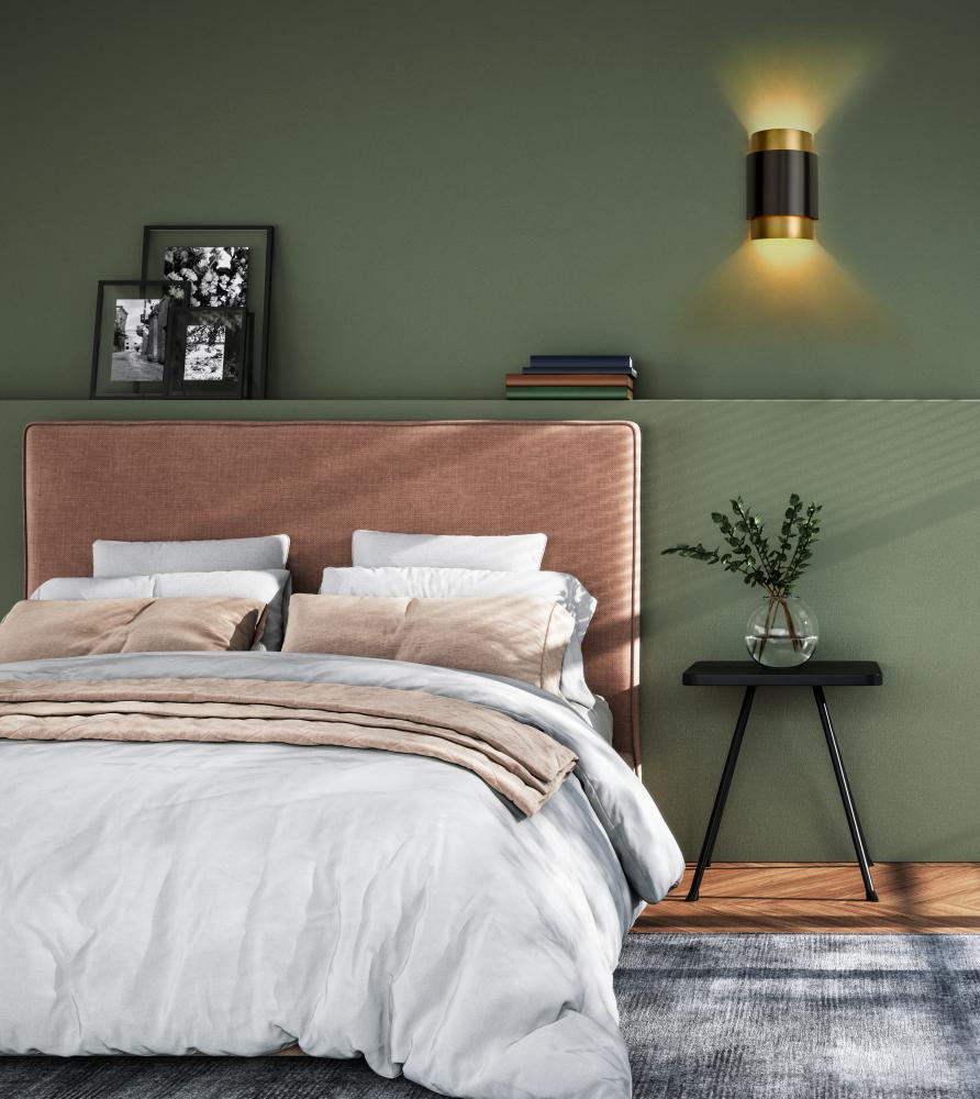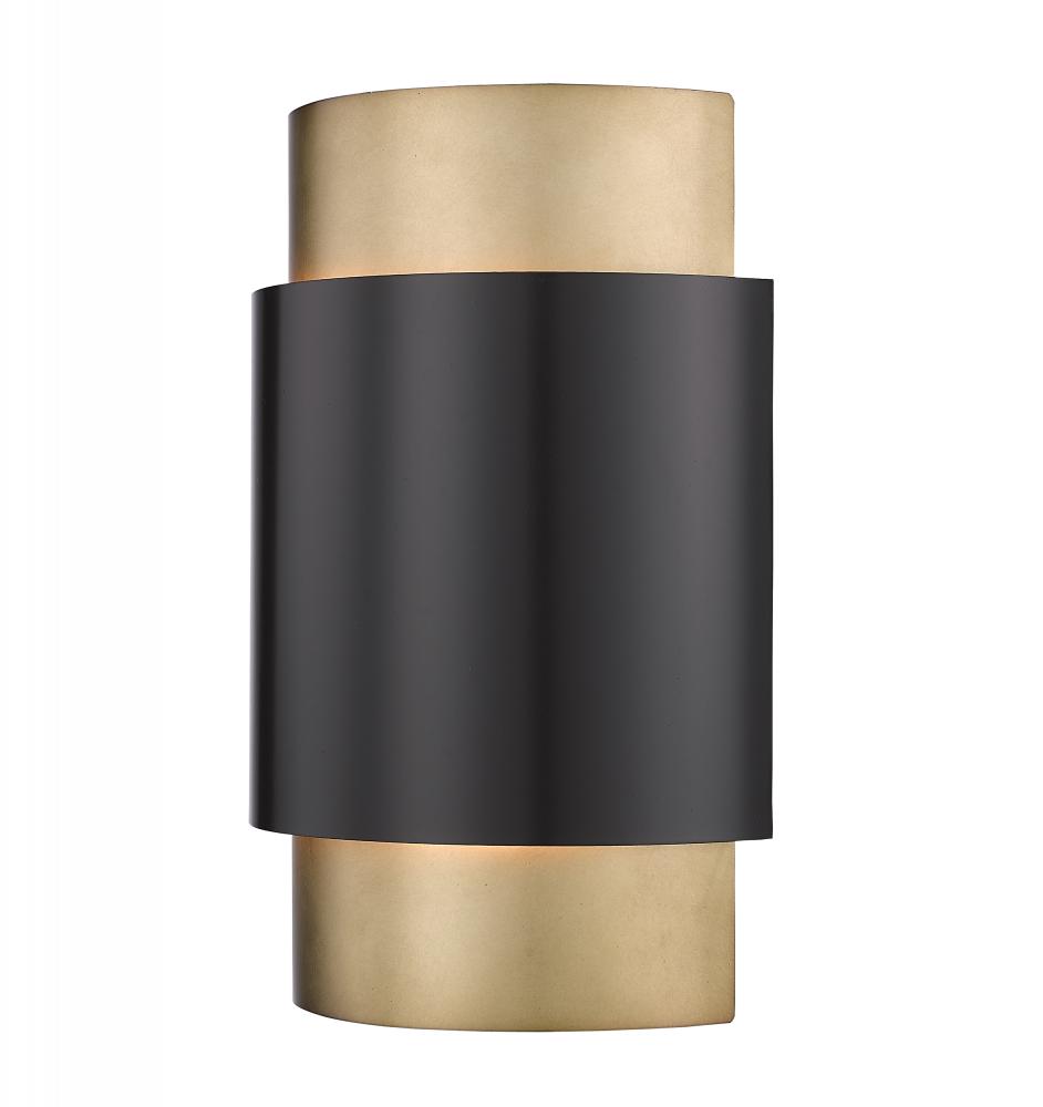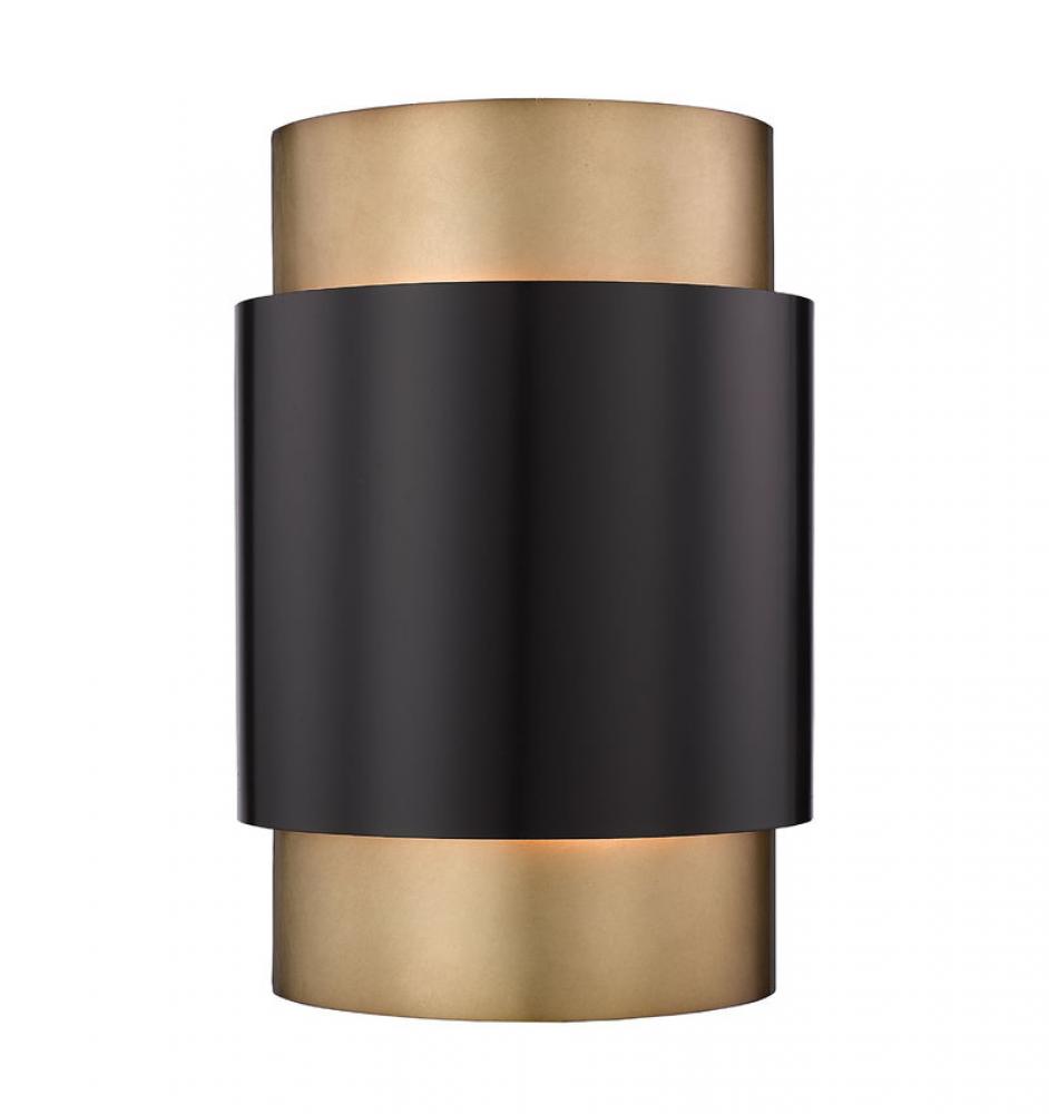 Expertly crafted in steel, this modern two-light wall sconce delivers a touch of Art Deco elegance to your living area or entryway. Its layered drum shade boasts a slender interior cylinder in a warm rubbed brass finish, complemented with a shorter and wider cylinder in a deep bronze finish. Refined without overwhelming surrounding decor, this sconce is a charming addition.