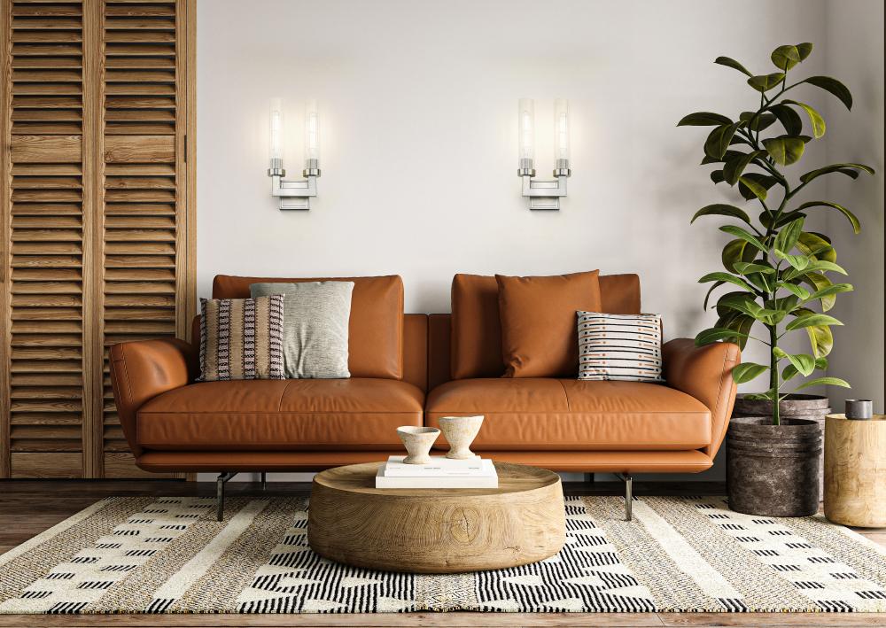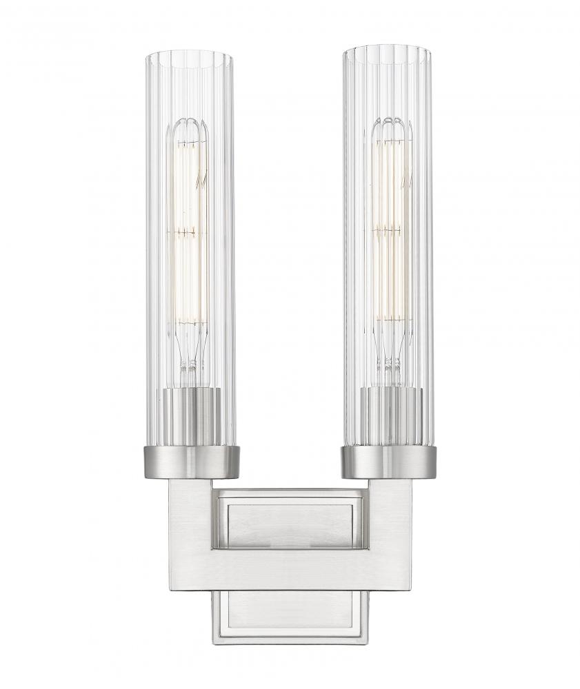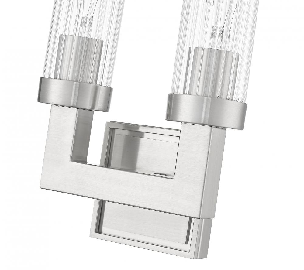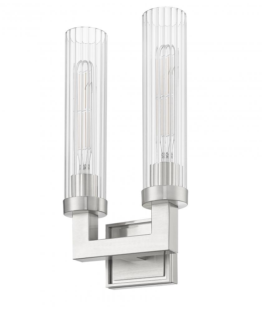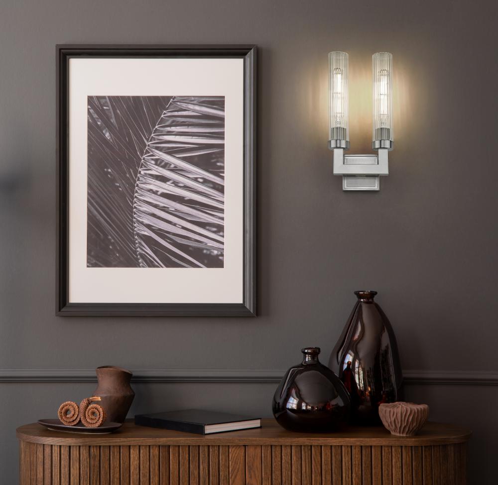Square tube arms in a U-shaped configuration create a bold structure for this modern two-light wall sconce. A brushed nickel finish encourages contemporary aesthetics, perfect for living rooms, entries, bedrooms and dining areas. Clear ribbed glass is used for cylindrical shades, offering inviting verticality to the fixtures overall look and feel.