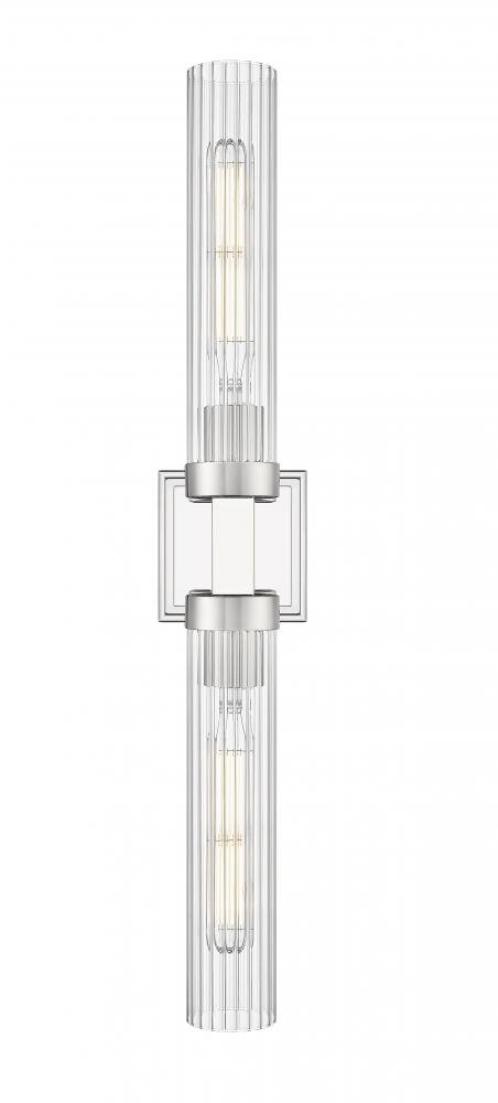 Gleaming polished nickel adds understated character and plenty of shine to this modern two-light wall sconce. Its linear profile is augmented with a decorative wall plate and arm that hosts a pair of fluted glass shades. They diffuse illumination and create a sense of artistry and dimensionality thats impressive in any setting.