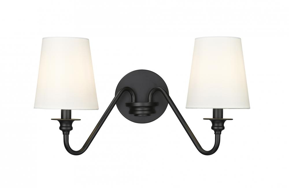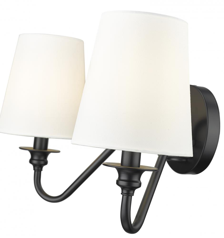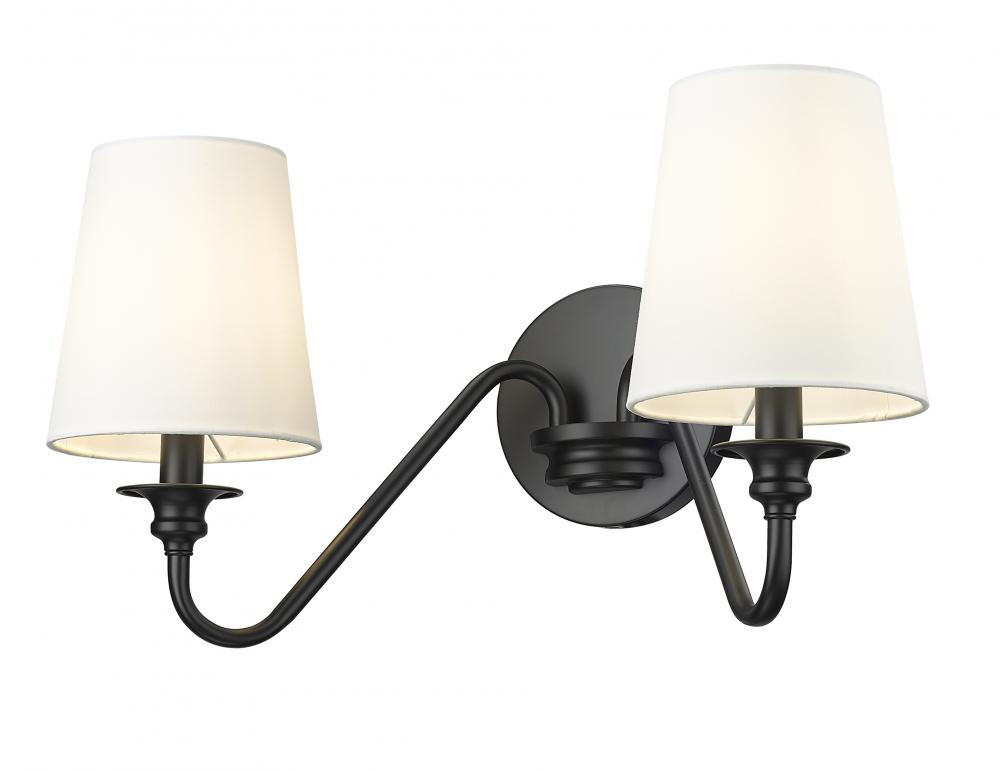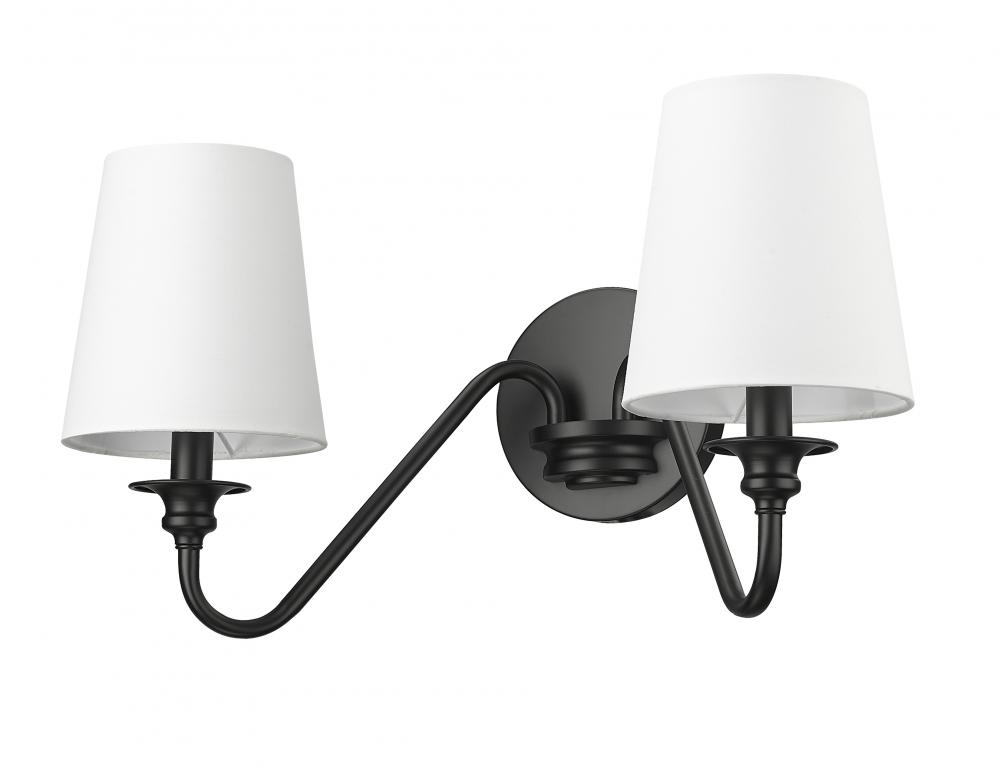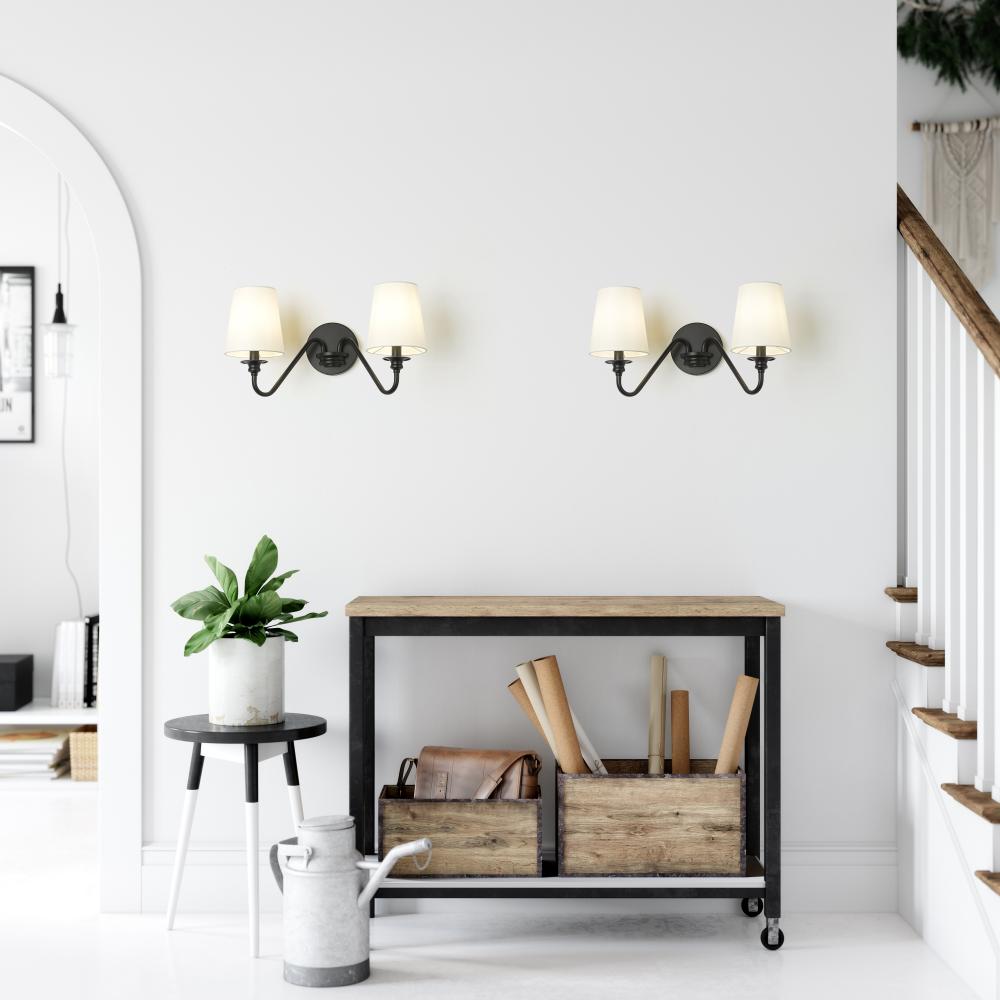 Put the finishing touches on a welcoming entry or living room with a modern two-light wall sconce. From the Gianna collection, its a simple, sleek silhouette featuring two curved arms and a round wall plate, all in a classic matte black finish. A pair of conical shade in opaque white create the perfect ambiance for modern living.