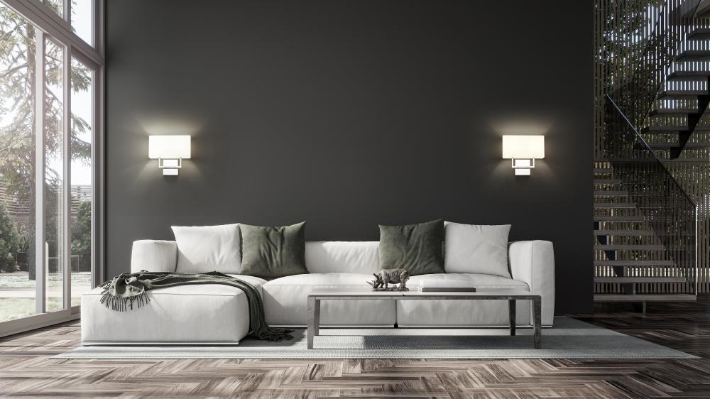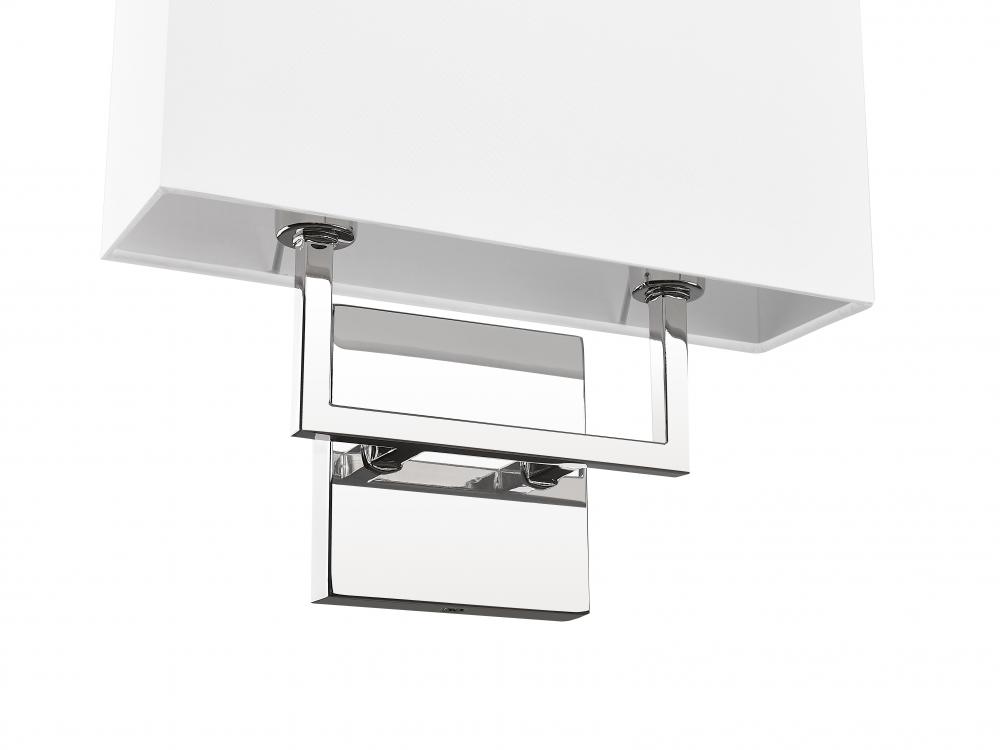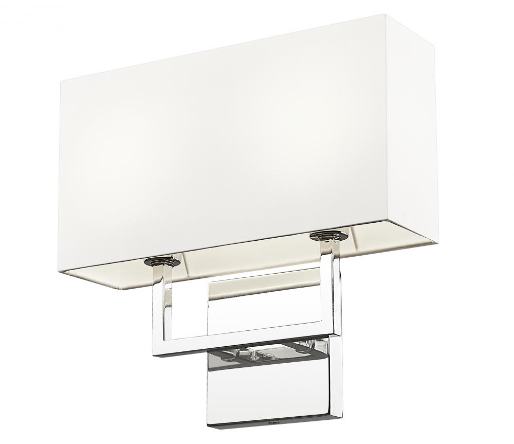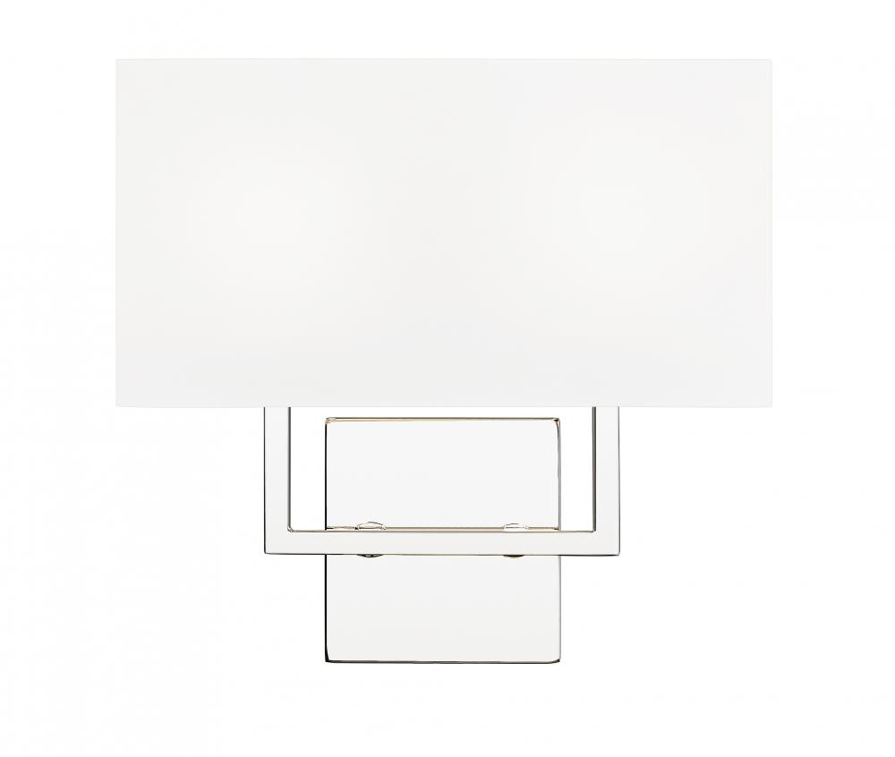 Cool and clean, this modern two-light wall sconce shows off a fresh silhouette and refined finishes. In polished nickel with an white fabric half-shade, the fixture casts inviting, true illumination across your entry or living room. Its angular arm design and squared wall plate offer clean-lined elegance, perfect for elegant homes.