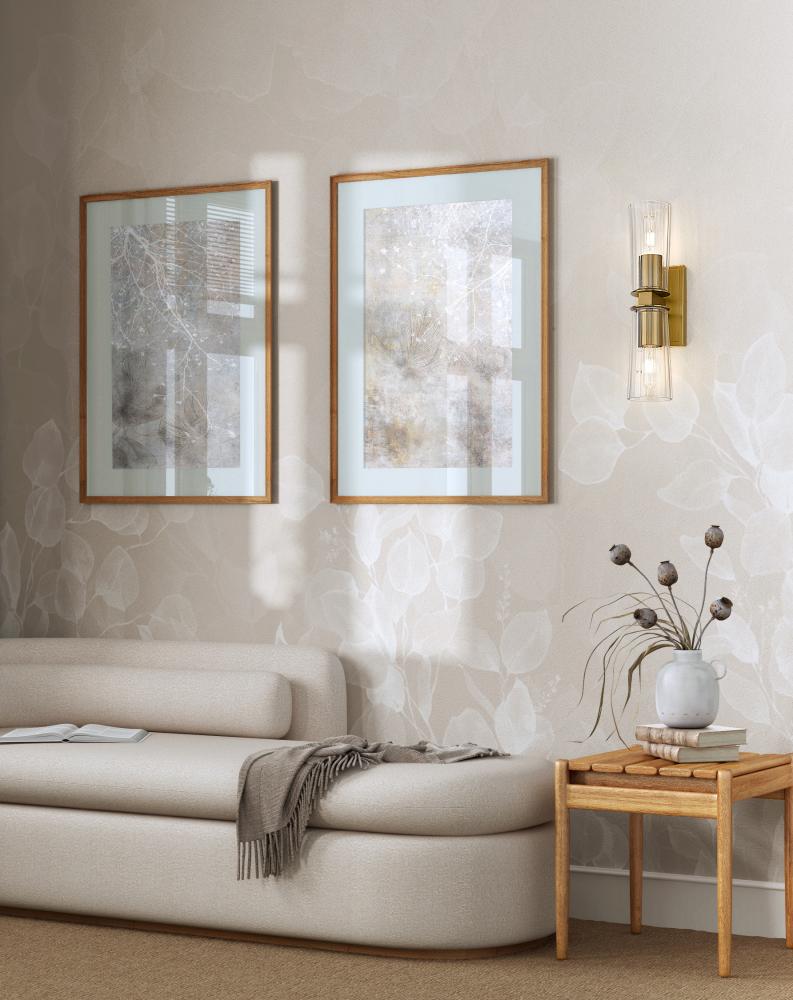 Instill a sense of sophistication with the sleek silhouette and warm modern gold finish of this contemporary two-light wall sconce. Designed to make a statement, it offers up and down lighting in any setting, lending the perfect hint of drama. Tapered shades are made in clear glass, adding delicacy to a pair of tubular bulbs that contribute vintage charm.