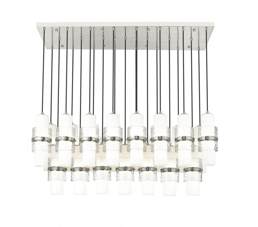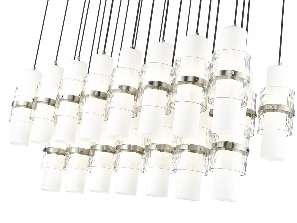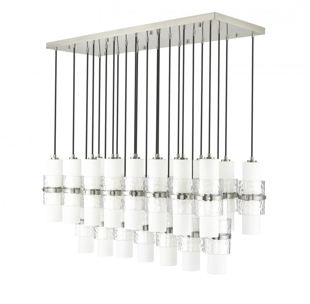 Tiered design and exquisite materials highlight a modern 23-light linear chandelier. Three rows of lights create a spectacular display, each with a layered shade that begins with an etched opal glass cylinder, adds clear textured glass and is secured with a decorative cuff in a rich brushed nickel finish to match its canopy. Braided cloth cord covers complete the look with fresh elegance, perfect for an island pendant in your kitchen or over a dining table.