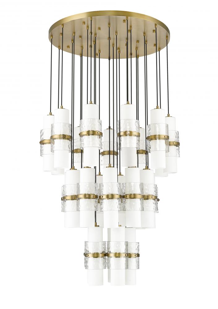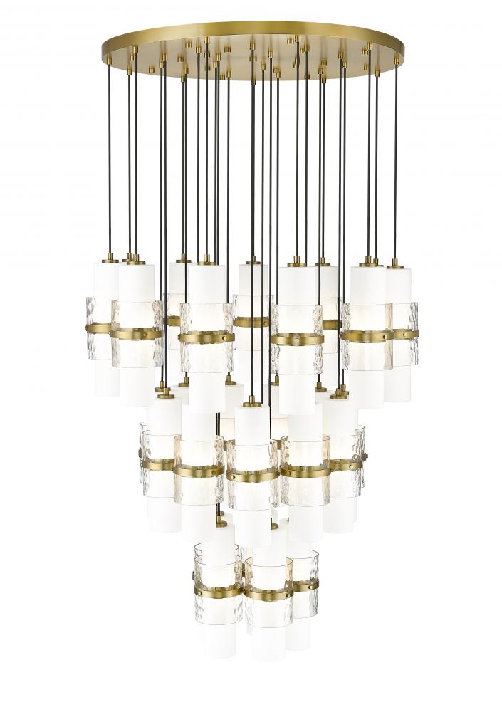 A trio of round tiers creates a chic, familiar silhouette for a striking, modern 27-light chandelier from the Cayden collection. Each light is suspended vertically, in three round tiers, and features a layered shade with a cylinder of etched opal glass overlaid with clear textured glass and a decorative metal cuff. The chandelier features a warm modern gold finish, perfect for upscale living and dining spaces.