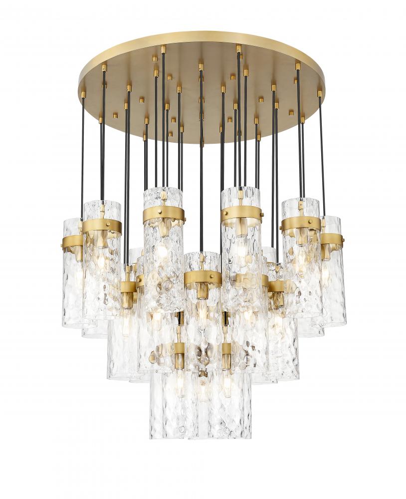 Opulent rubbed brass finishing creates incredible warmth and sophistication for this modern 27-light chandelier. Its round canopy and metal collars contrast beautifully against cylinders of rippling water glass, delivering powerful presentation and elegance.