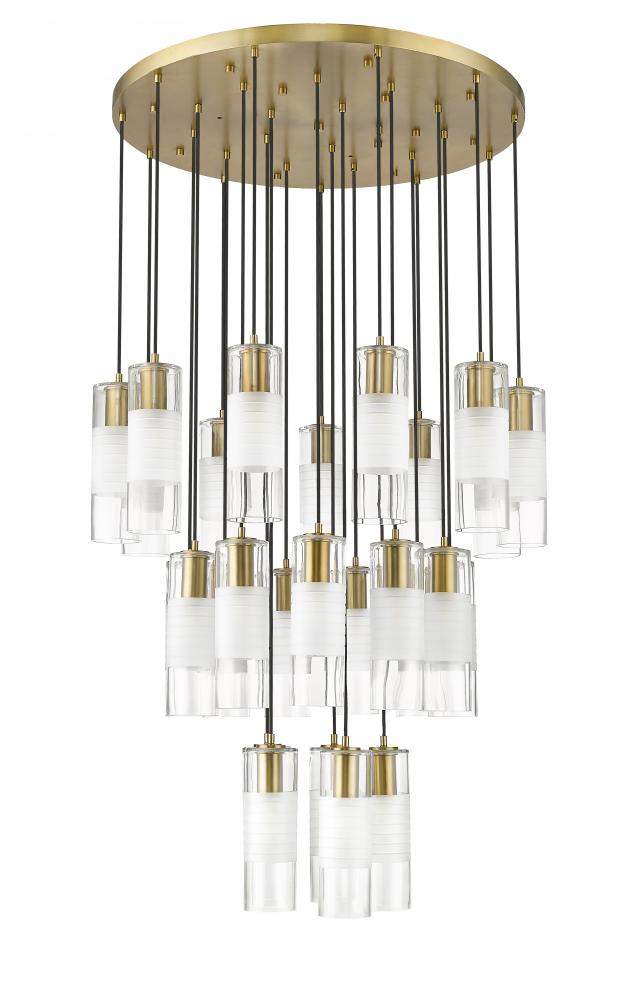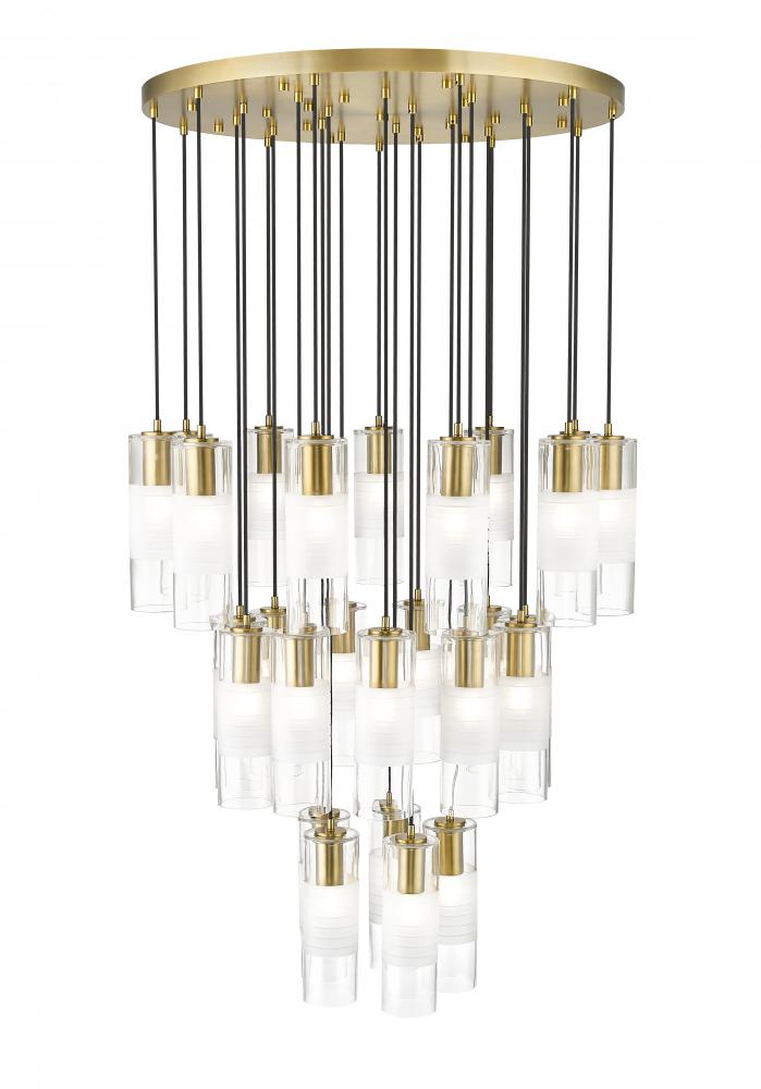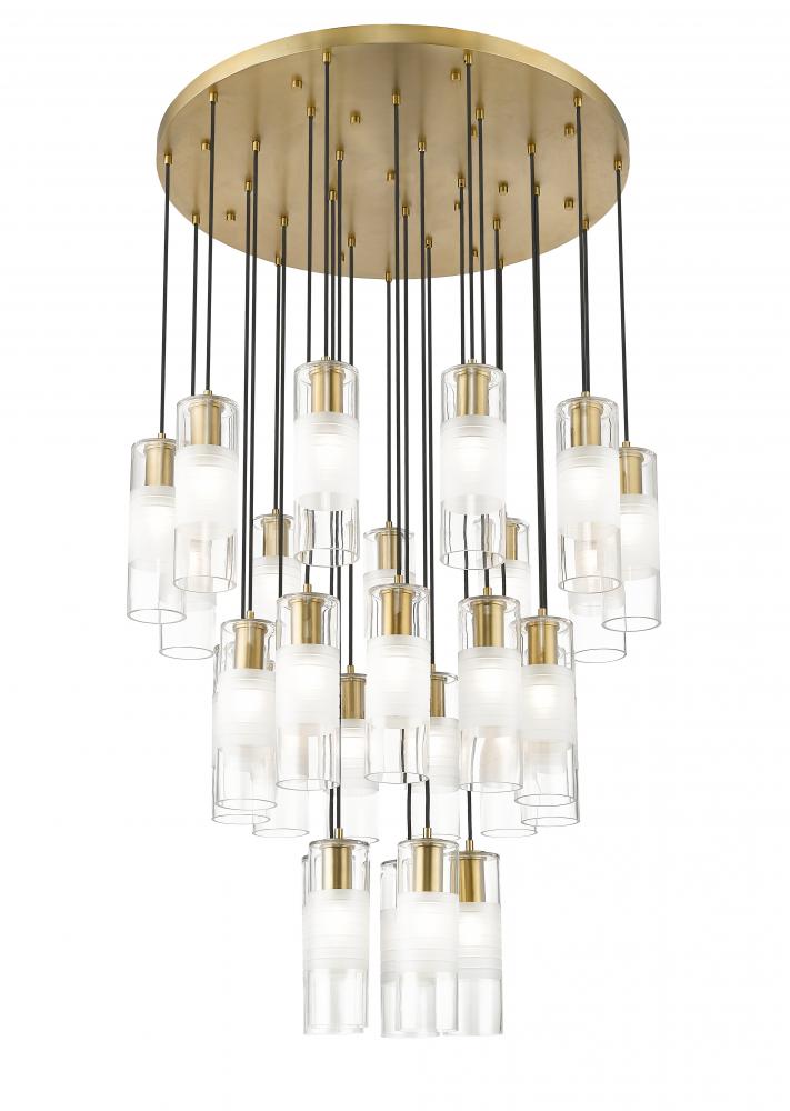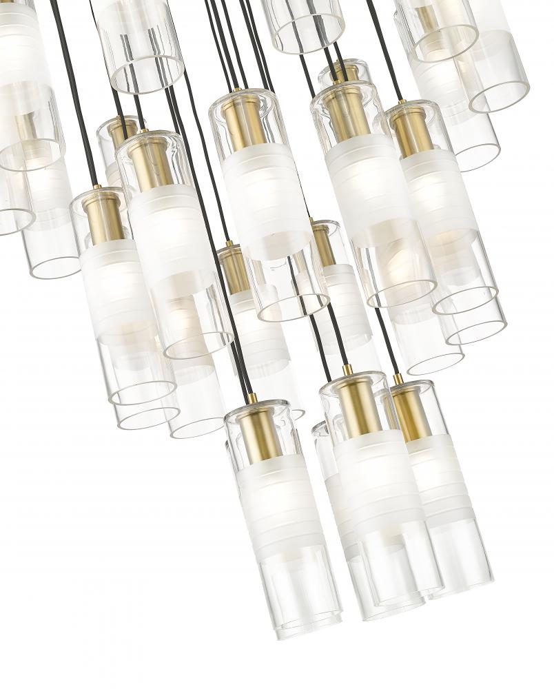 A trio of round tiers create a waterfall effect for 27 suspended lights that make up the Alton modern chandelier. Stunning over a staircase of grand dining table, it sparkles with clear and frosted glass elements and robust housings in a rich modern gold finish that gleams warmly in the light.