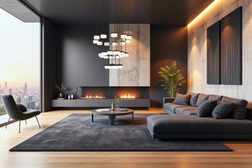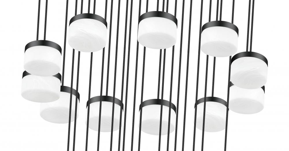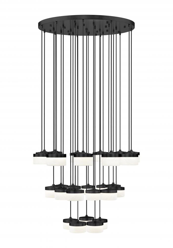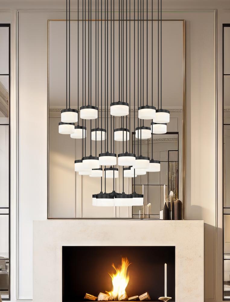 From a broad round canopy high above, this matte black 27-light LED chandelier releases slender cables to a cascade of clouded glass disks that seem to hover in space. The layered heights and generous lumen output suit double-height foyers and stairwells where you want impressive sparkle along with reliable illumination. Viewed from below or from an upper landing, the composition feels dynamic and refined, turning an everyday circulation space into a place people stop to look up.
